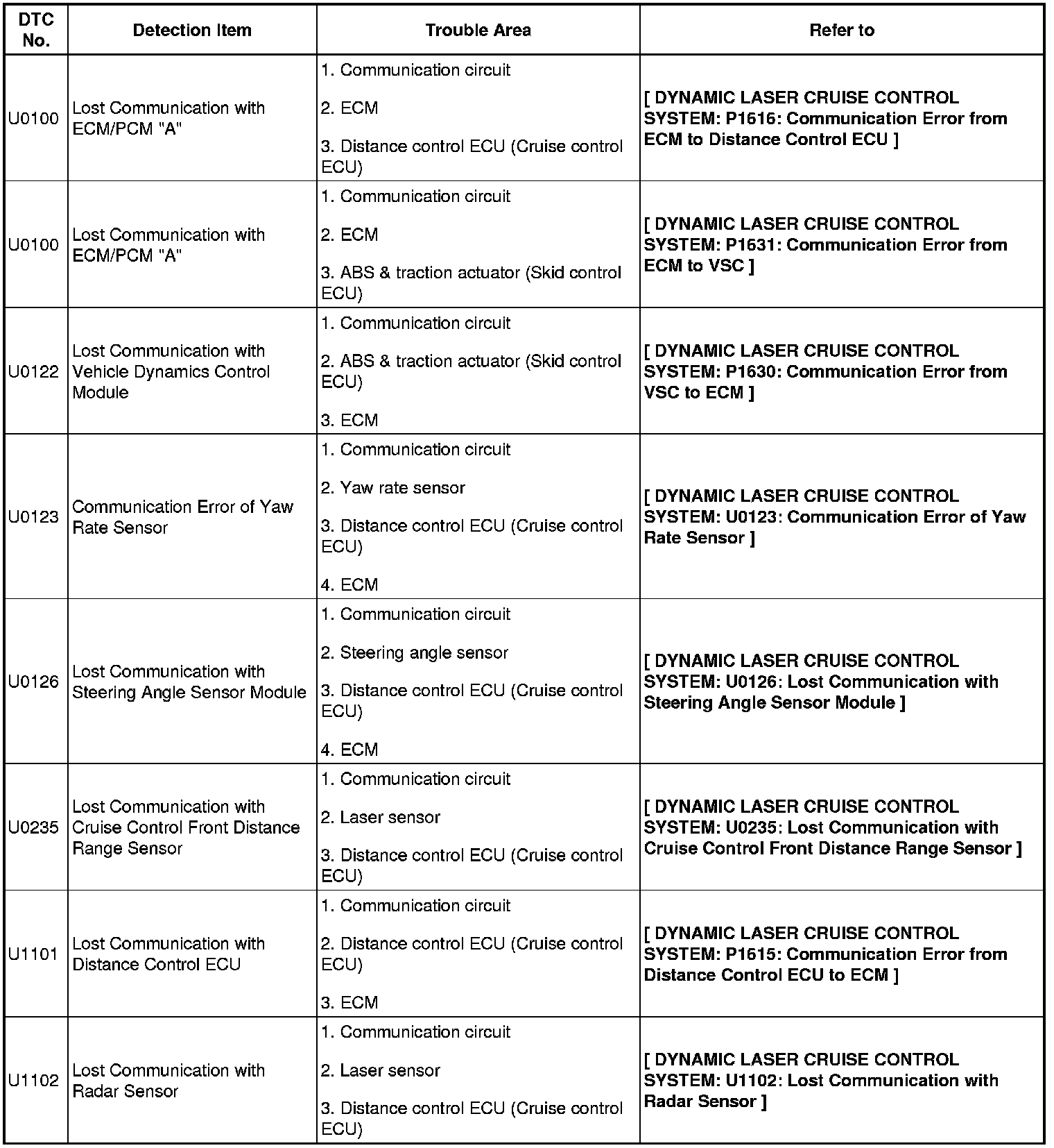 If a trouble code is displayed during the DTC check, check the trouble areas listed for that code in the table below.