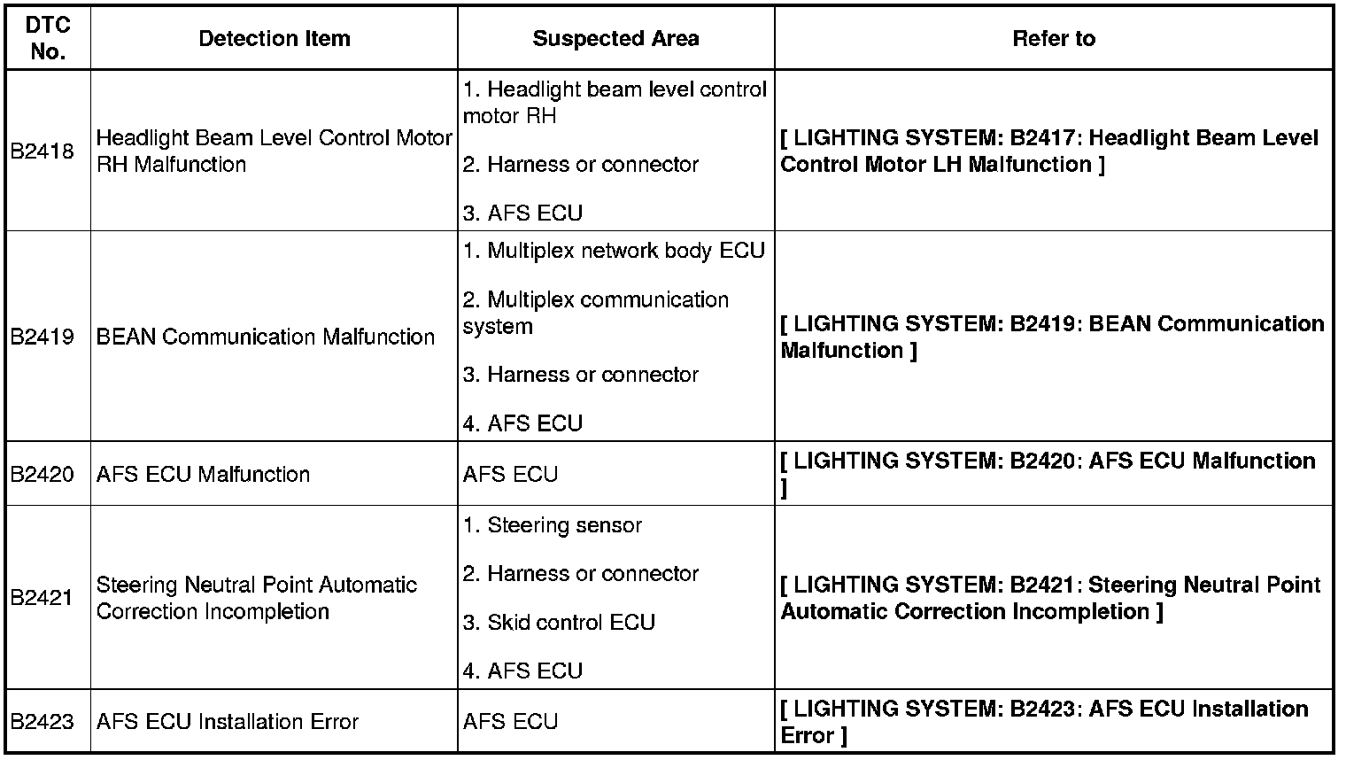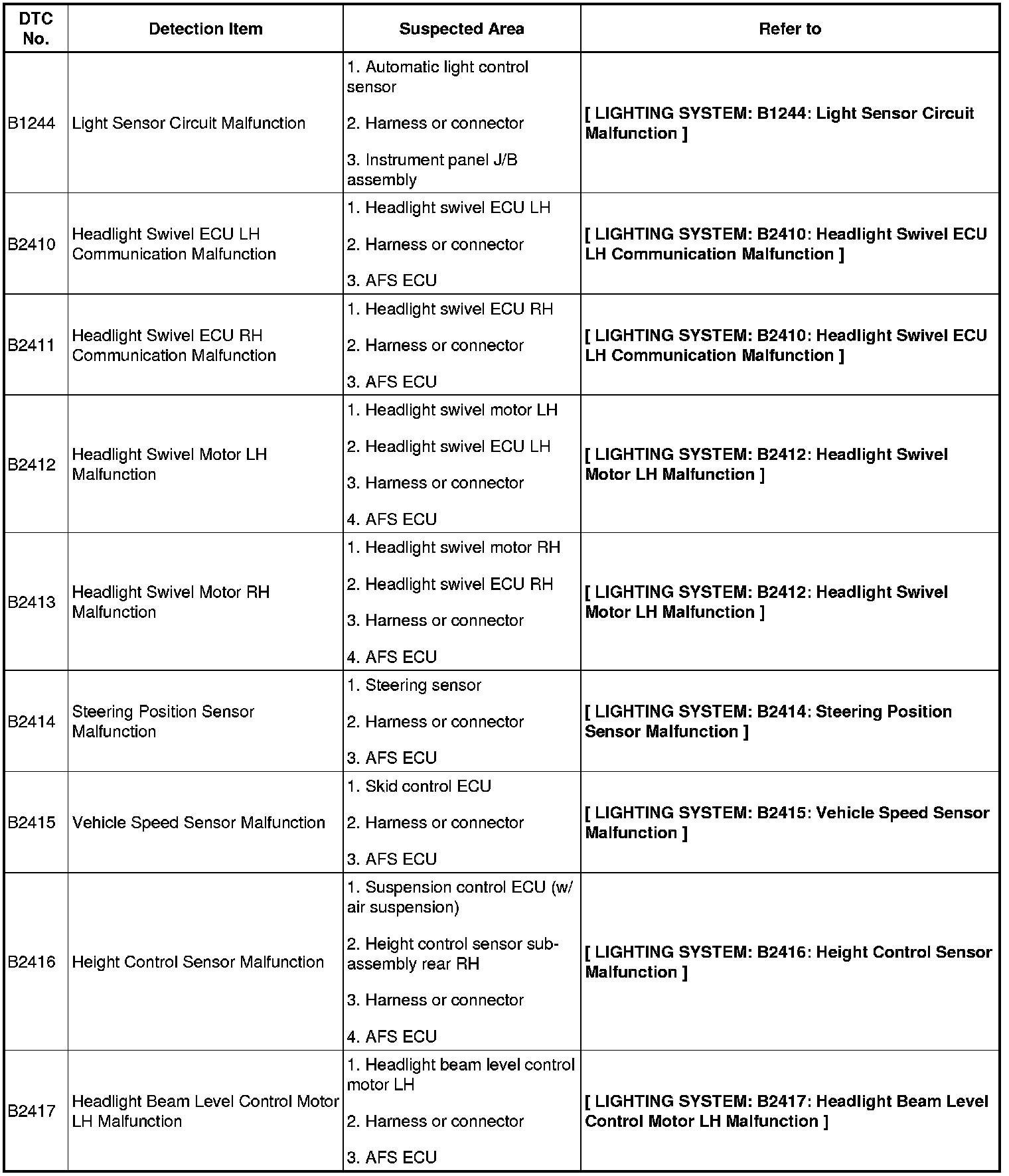 If a malfunction code is displayed during the DTC check, check the suspected area listed for that code in the table below.
