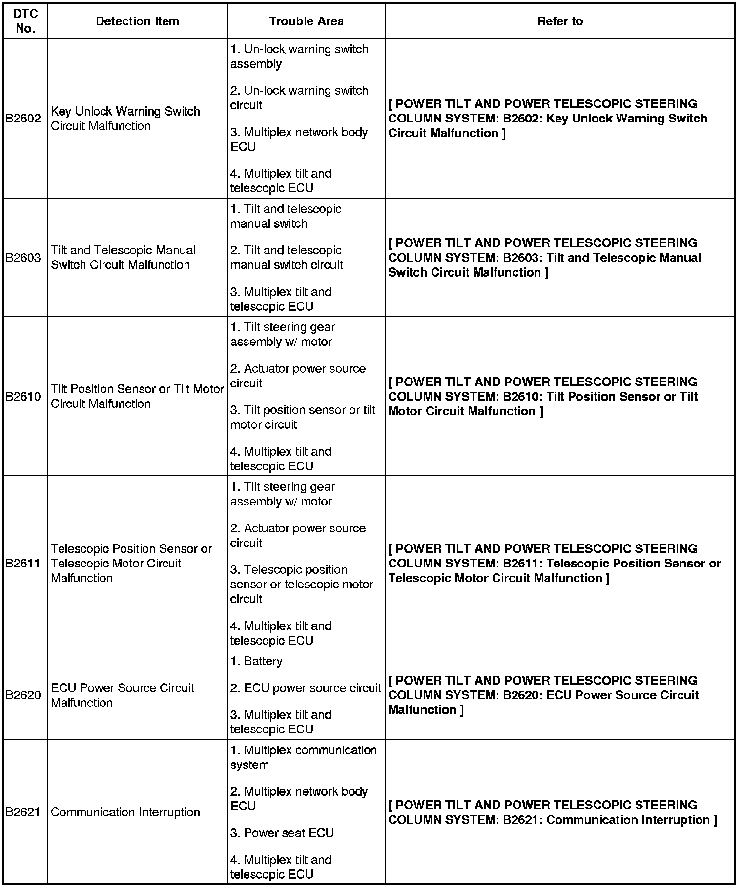If a DTC is displayed, check the circuit for that code listed in the table below. For details of each code, refer to the applicable Diagnostic Trouble Code Test.
