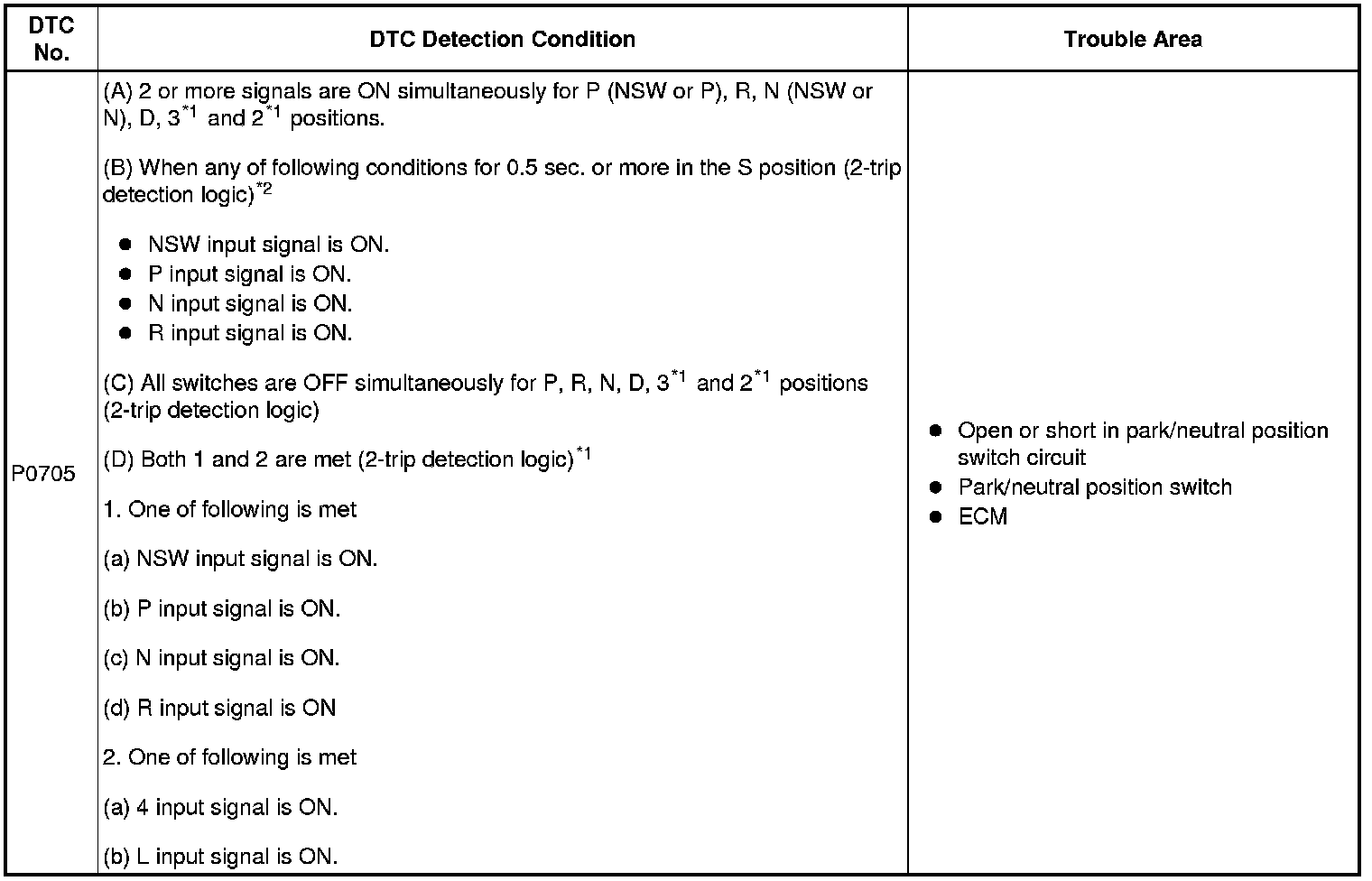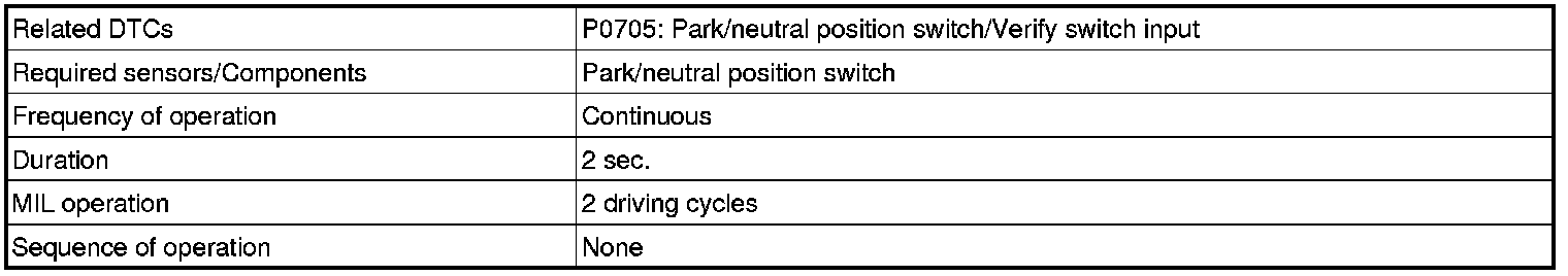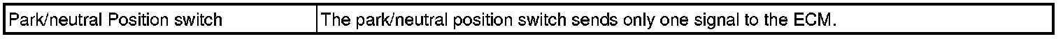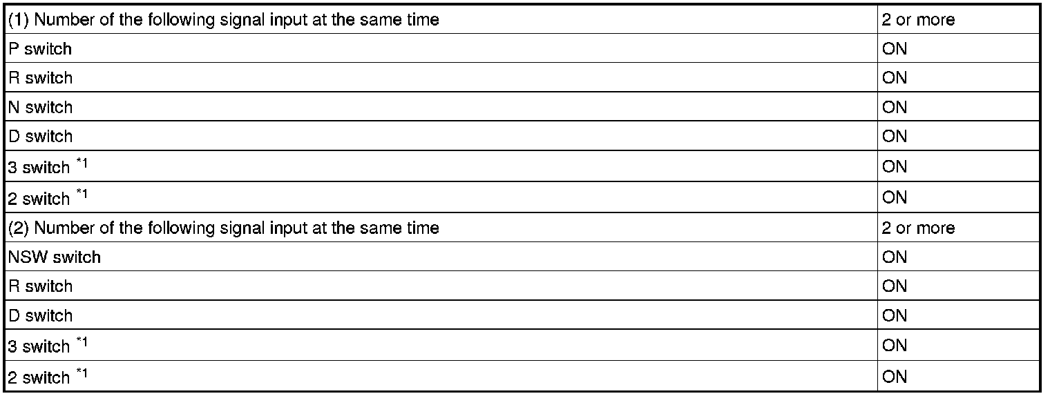 When the park/neutral position switch sends more than one signal at a time from switch positions P, R, N, D, 3*1 or 2*1, the ECM interprets this as a fault in the switch. The ECM will turn on the MIL.