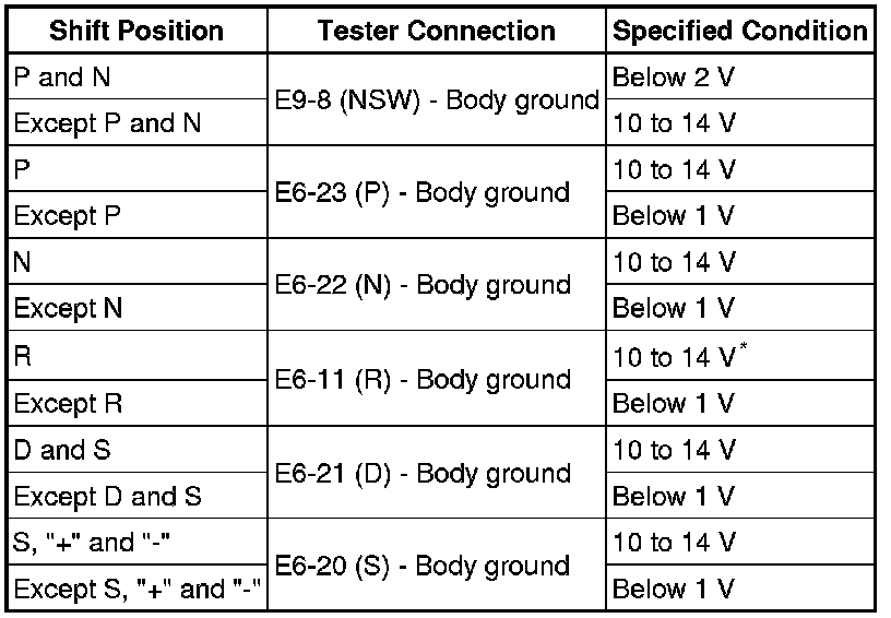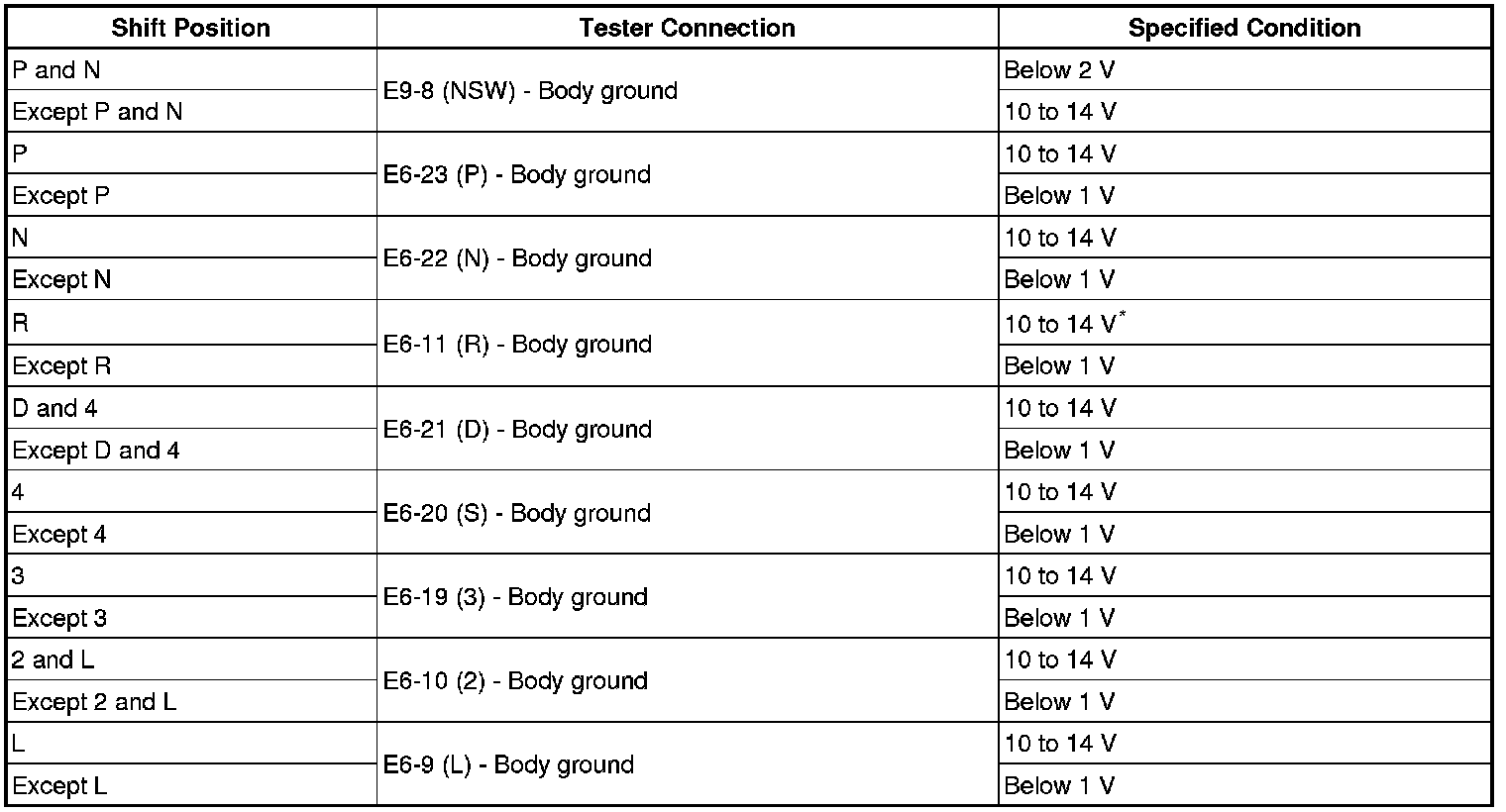 (b) Turn the ignition switch to the ON position, and measure the voltage according to the value(s) in the table below when the shift lever is moved to each position.