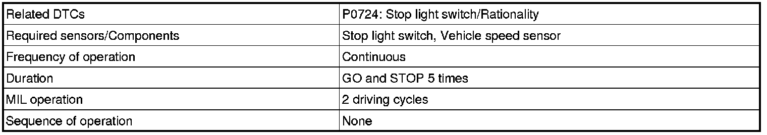 This DTC indicates that the stop light switch remains on. When the stop light switch remains ON during "stop and go" driving, the ECM interprets this as a fault in the stop light switch and the MIL comes on and the ECM stores the DTC. The vehicle must stop (less than 2 mph (3 km/h)) and go (19 mph (30 km/h) or more) 5 times for two driving cycles in order to detect a malfunction.