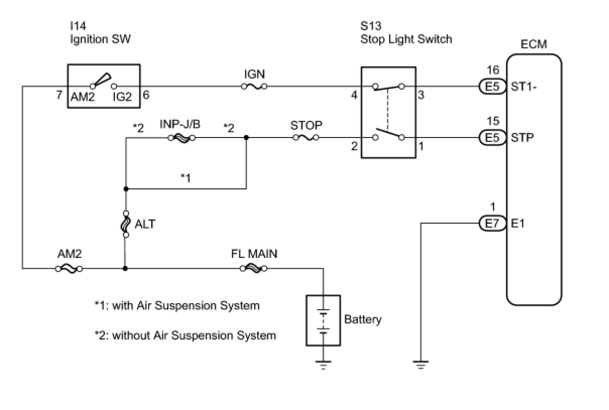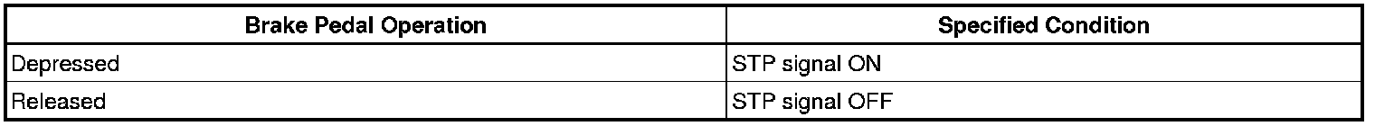The stop light switch is a duplex system that transmits two signals: STP and ST1-. These two signals are used by the ECM to monitor whether or not the brake system is working properly. If the signals, which indicate the brake pedal is being depressed or released, are detected simultaneously, the ECM interprets this as a malfunction in the stop light switch and sets the DTC.