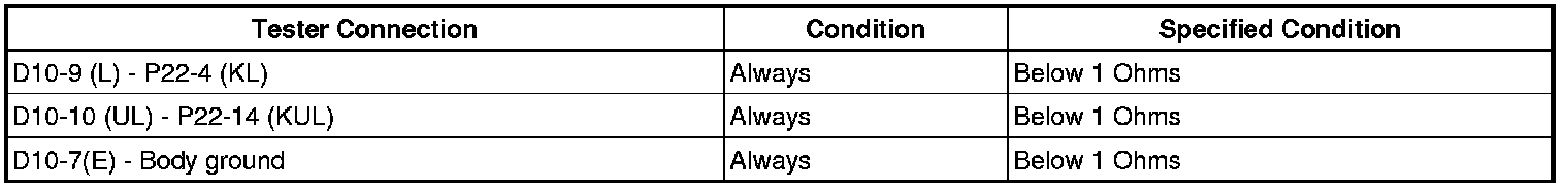 When the driver's door key cylinder is turned to lock all the doors by key, there is continuity between terminals L and E of the key lock and unlock switch. When the cylinder is turned to unlock the door(s), there is continuity between terminals UL and E.