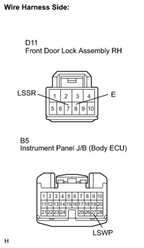 The body ECU is connected to the front passenger door lock assembly via terminal LSWP and front passenger door lock/unlock state signals are input to the ECU.