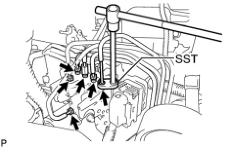 (b) Using SST, disconnect the 6 brake tubes from the brake actuator with brake actuator bracket.