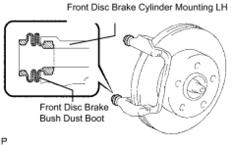 (a) Remove the 2 front disc brake cylinder bush dust boots from the front disc brake cylinder mounting LH.