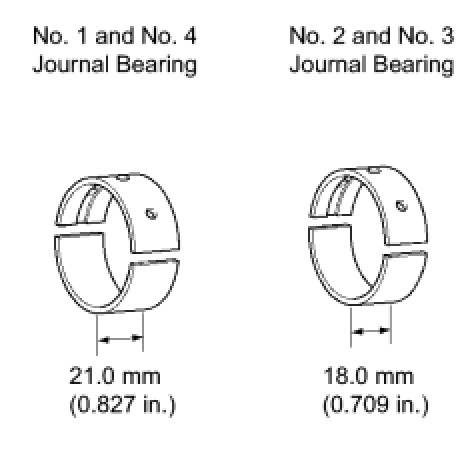 NOTE: Main bearings come in widths between 18.0 mm (0.709 in.) and 21.0 mm (0.827 in.). Install the 21.0 mm (0.827 in.) bearings in the No. 1 and No. 4 cylinder block journal positions with the main bearing cap. Install the 18.0 mm (0.709 in.) bearings in the No. 2 and No. 3 positions.