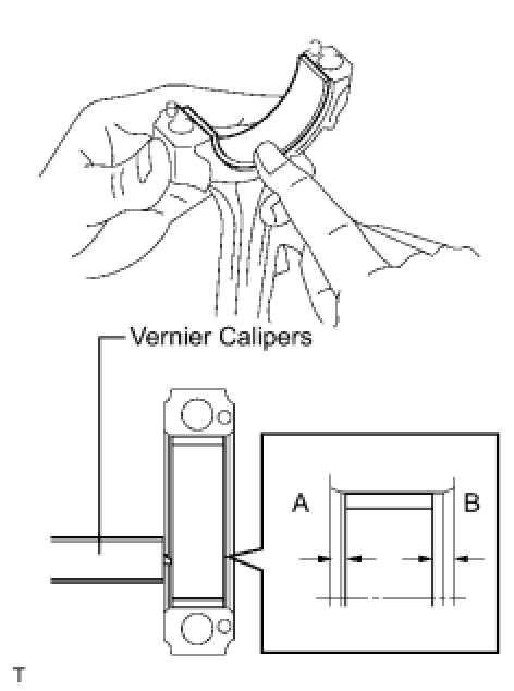 (b) Using vernier calipers, measure the distance between the connecting rod's and bearing cap's edges and the connecting rod bearing's edge.
