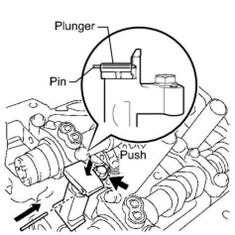 (b) While pushing in the tensioner, insert a pin of dia 1.0 mm (0.039 in.) into the hole to hold it.