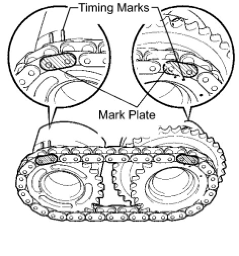 (d) Align the mark plate and timing marks as shown in the illustration and install the chain onto the crankshaft timing sprocket.