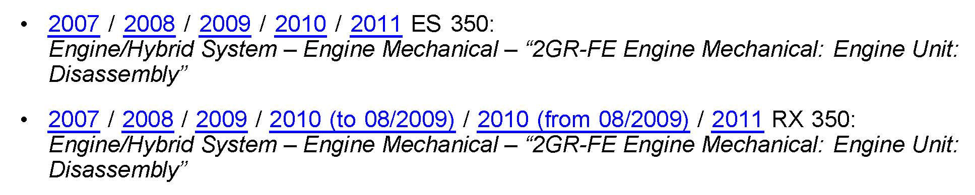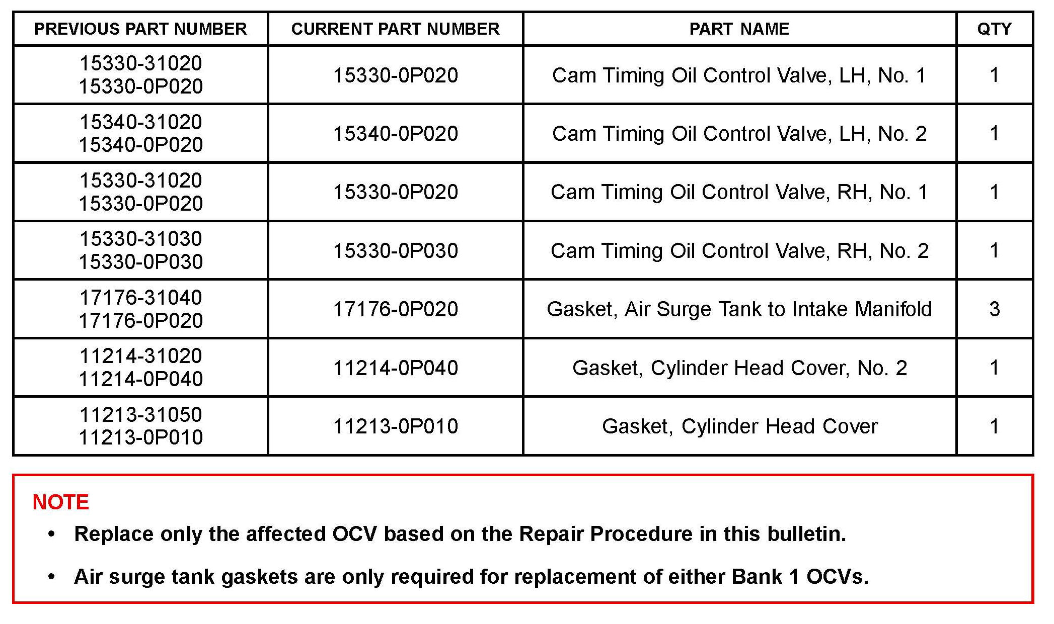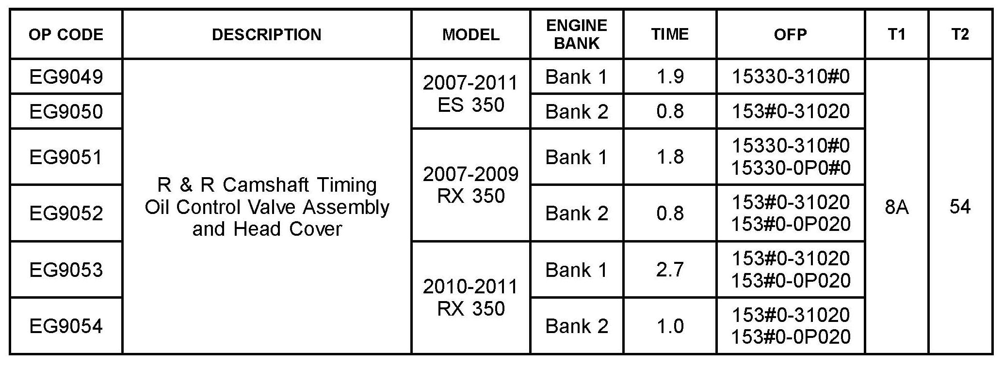 Some 2007 - 2011 model year ES 350 and RX 350 vehicles may exhibit a MIL "ON" condition with one or more VVT-i related Diagnostic Trouble Codes (DTCs) stored in the Engine Control Module or ECM (SAE term: Powertrain Control Module/PCM). Please use the following repair procedure to address this condition.