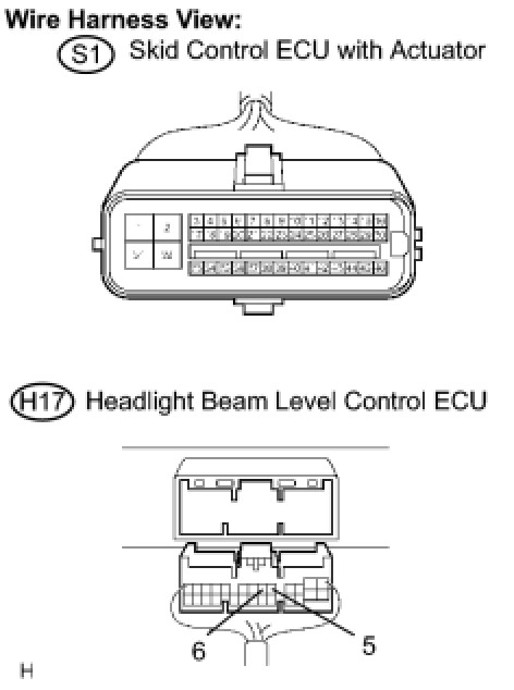 (a) Disconnect the S1 connector of skid control ECU and the H17 connector of headlight beam level control ECU.