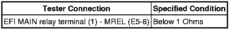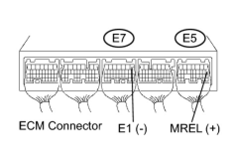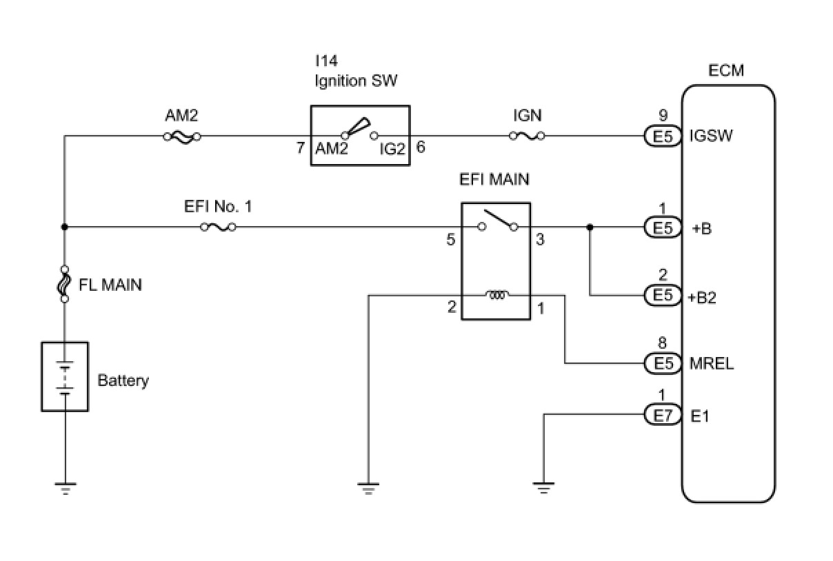 When the ignition switch is turned to the ON position, the battery voltage is applied to terminal IGSW of the ECM. The ECM MREL output signal causes a current to flow to the coil, closing the contacts of the EFI relay and supplying power to terminal +B of the ECM.