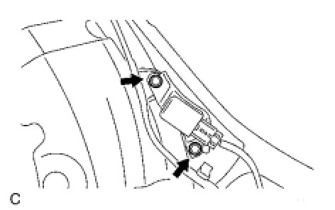 - When installing the rear airbag sensor LH, be careful that the SRS wiring does not interfere with other parts and that it is not pinched between other parts.