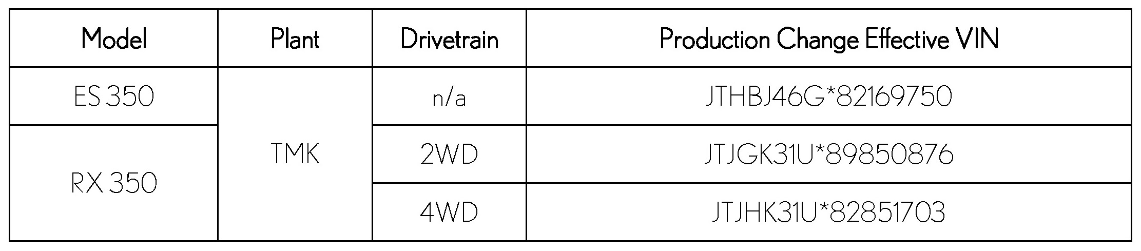 - 2007 - 2008 model year RX 350 (Japan built) vehicles equipped with the 2GR-FE engine and produced BEFORE the Production Change Effective VINs shown below.
