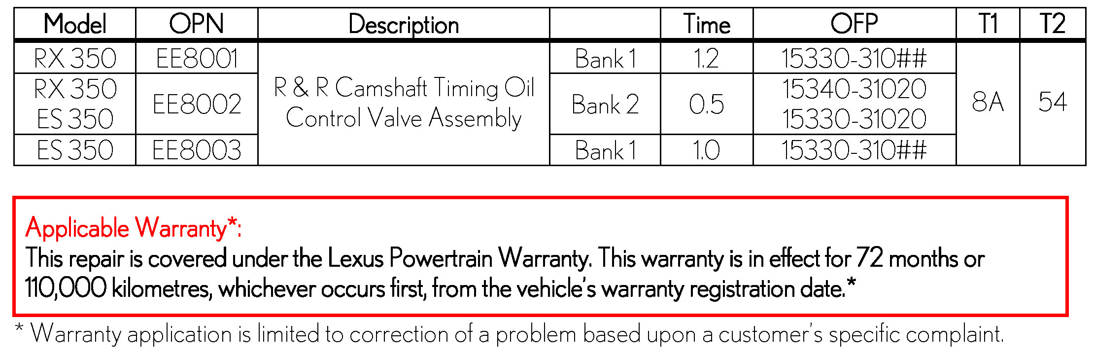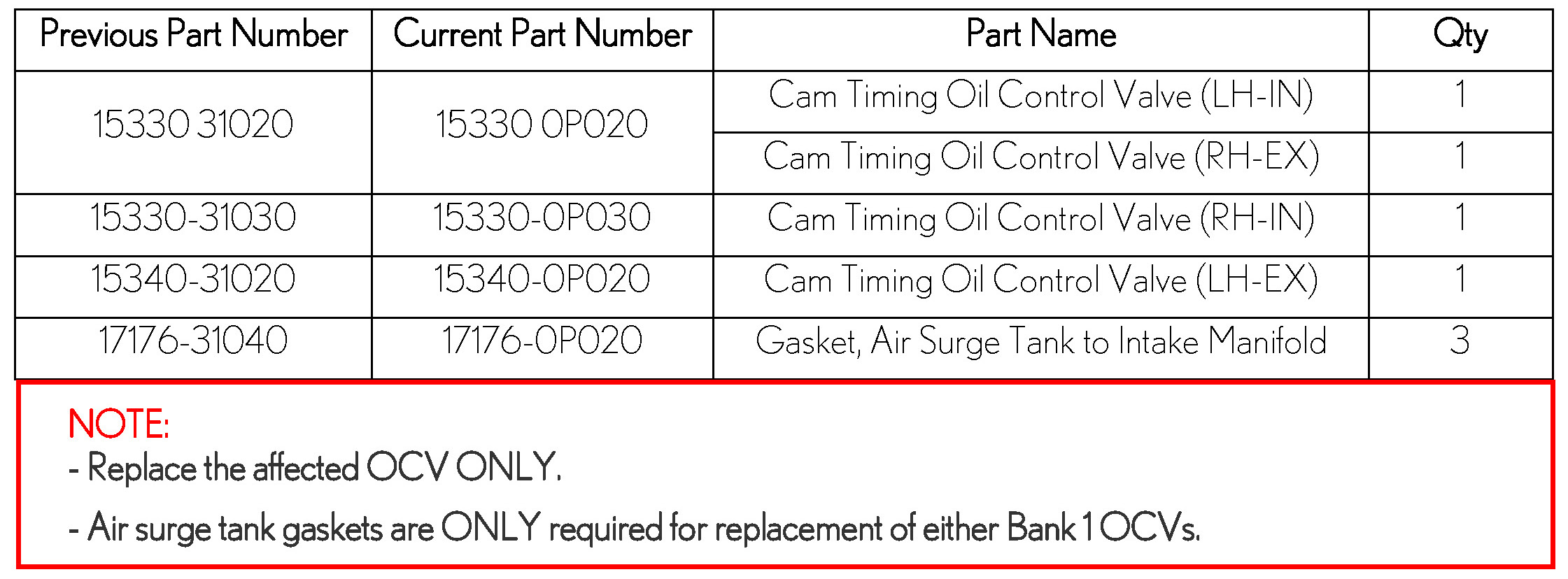 Remove and replace the affected OCV. Refer to the Repair Manual within E-TAS / TIS library: