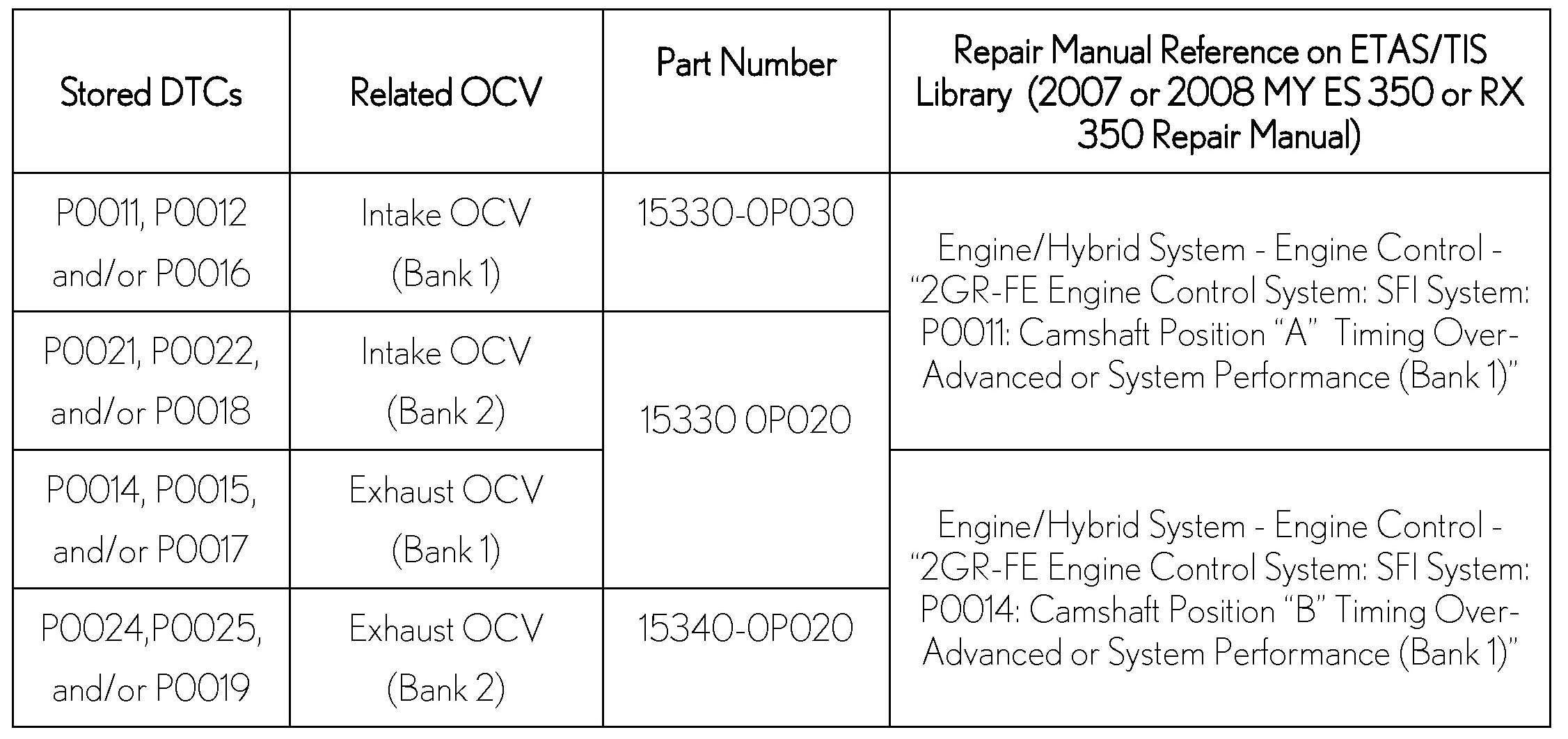Some 2007 - 2008 model year ES 350 and RX 350 vehicles may exhibit a M.I.L. "ON" condition with one or more VVTi related Diagnostic Trouble Codes (DTCs) stored in the Engine Control Module or ECM (SAE term: Powertrain Control Module/PCM). Please use the repair procedure below to address customer concerns.