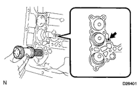 (a) Apply compressed air (392 kPa, 4.0 kgf/cm2, 57 psi) to the oil hole and remove the reverse accumulator piston and spring.