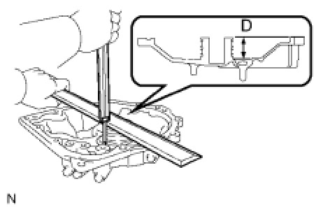 (d) As shown in the illustration, place a straightedge on the direct clutch drum and measure the distance between the transaxle case and the straightedge using vernier calipers (Dimension C).