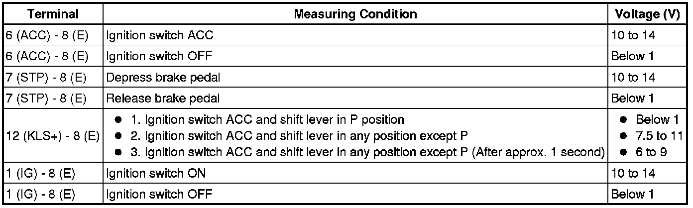 (d) Turn the ignition switch to the ON position, depress the brake pedal, and check that the shift lever can be moved to another position. If operation cannot be done as specified, inspect the shift lock control unit.