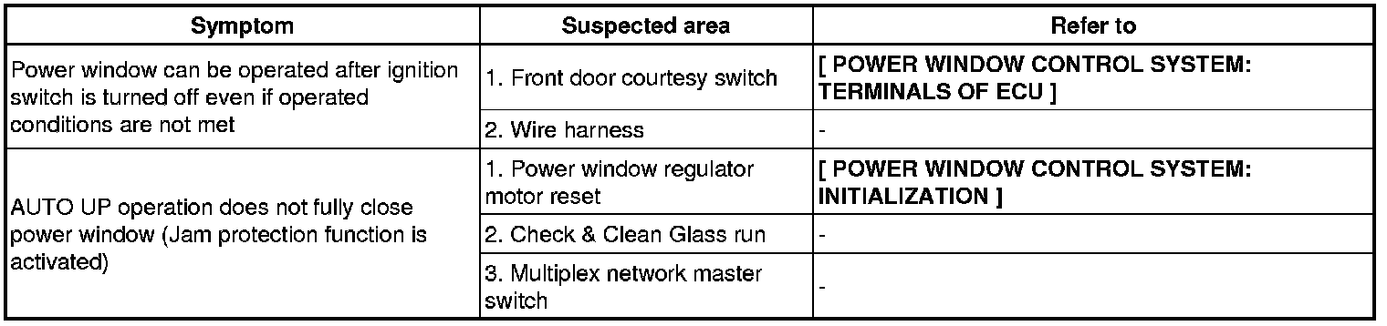 WINDSHIELD / WINDOWGLASS: POWER WINDOW CONTROL SYSTEM: PROBLEM SYMPTOMS TABLE