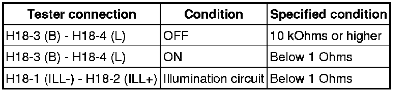(1) Connect the positive (+) lead from the battery to the terminal H18-2 and negative (-) lead to the terminal H18-1, then check that the illumination comes on.