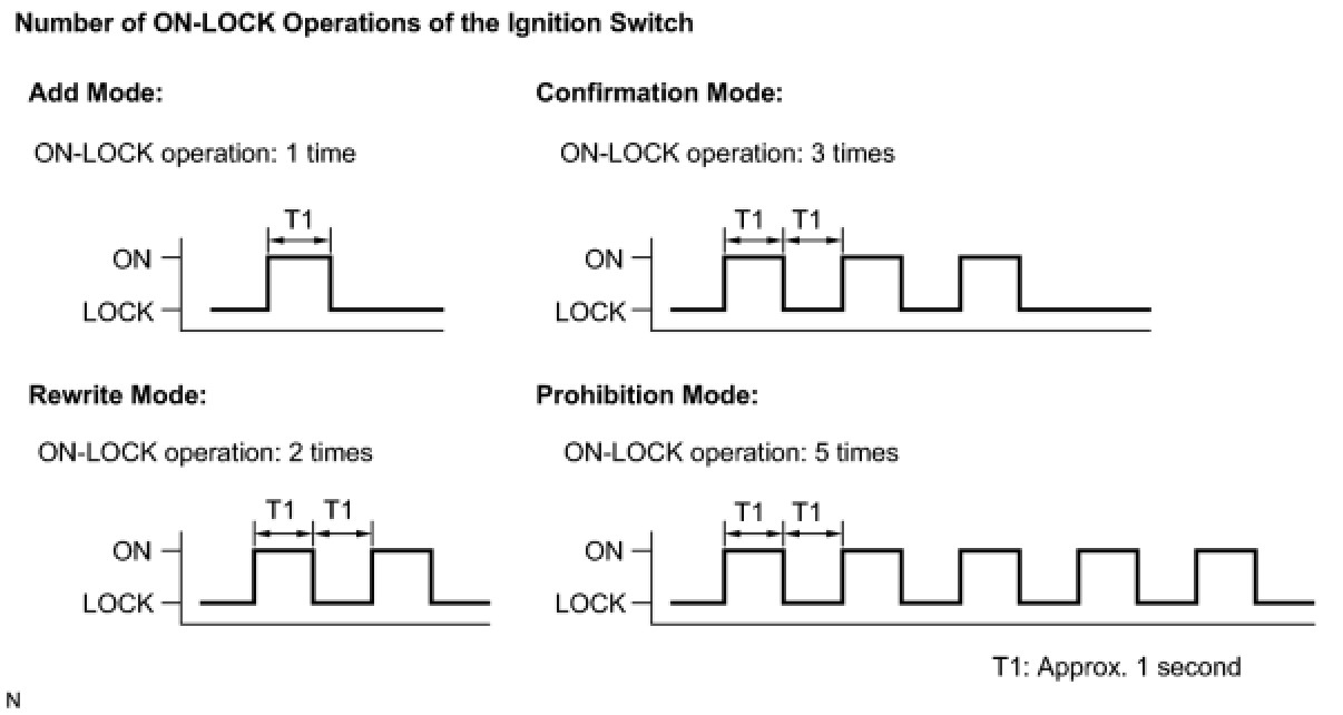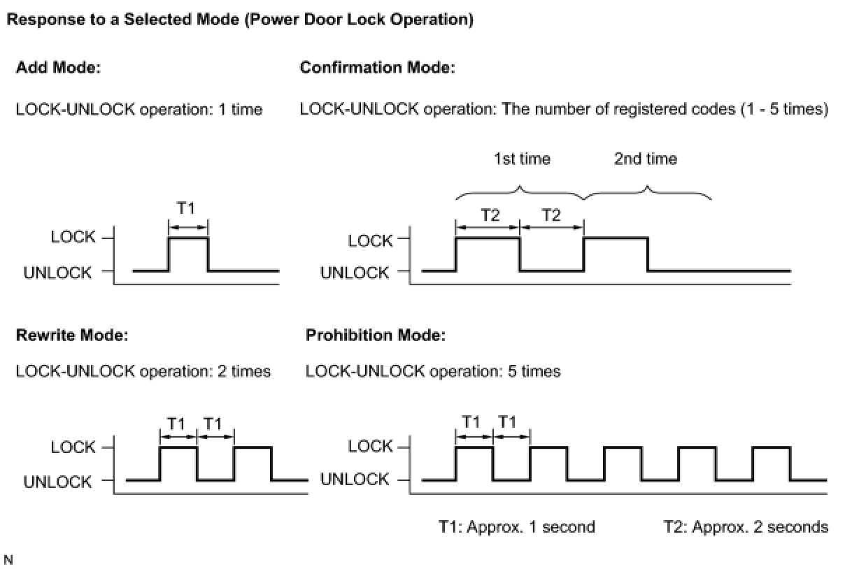 HINT: If the number of ON-LOCK operations of the ignition switch is 0, 4 or 6 or more, there will be no response (power door lock and unlock operation) to show which mode has been selected.
