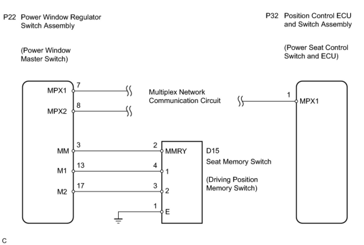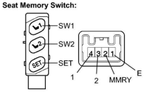 The seat memory switch sends signals to the power window regulator switch assembly (power window master switch) via the multiplex communication system to memorize a given seat position. This memory system does not use a position sensor. The seat position is detected by counting pulses that are output when the motor turns. If there is no pulse output from the motor, the motor will stop operating. The seat memory switch is later used to send signals to the front power seat switch to return the seat to one of the memorized positions.