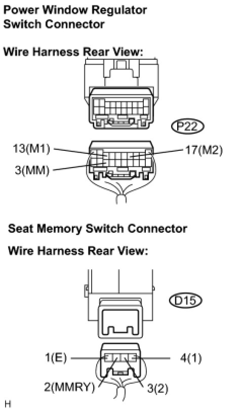 4. CHECK HARNESS AND CONNECTOR (POWER WINDOW REGULATOR SWITCH ASSEMBLY - SEAT MEMORY SWITCH)