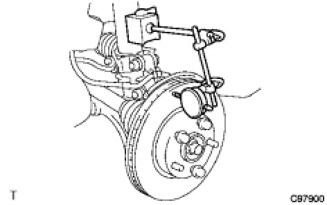 (c) If the disc runout is greater than the maximum value, check the bearing play in the axial direction and check the axle hub runout Testing and Inspection. If the bearing looseness and axle hub runout are normal, adjust the disc to find the position where the disc has the minimum runout. When the disc is still unadjustable, grind it on an "On-car" brake lathe. In case the disc is too thin and ungrindable, try with a new disc.