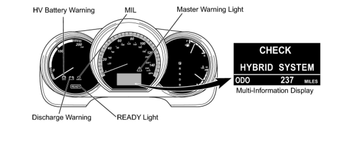 (a) The HV control ECU has a self-diagnosis system. If the computer, hybrid vehicle control system or the components are not working properly, the ECU carries out a diagnosis to detect the malfunction, and illuminates the master warning light in the combination meter together with any of the indicators on the multi-information display, the HV system warning, the HV battery warning or the discharge warning.