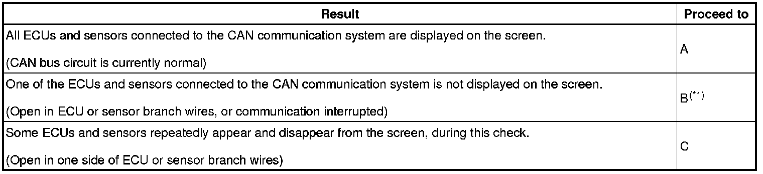 - The ECUs and sensors that repeatedly appear and disappear from the screen during this check are considered normal. (The response to Techstream and the tester display are affected by signals output from other ECUs which have an open circuit in either of their CAN branch wires.)