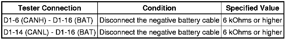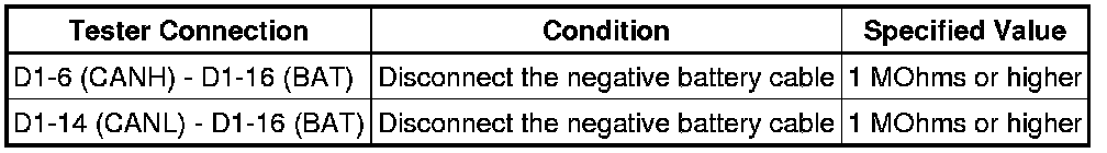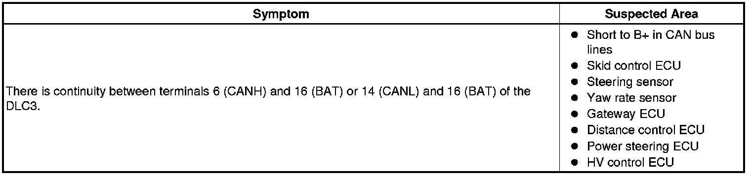 There may be a short circuit between the CAN bus line and B+ if there is continuity between terminals 6 (CANH) and 16 (BAT), or terminals 14 (CANL) and 16 (BAT) of the DLC3.