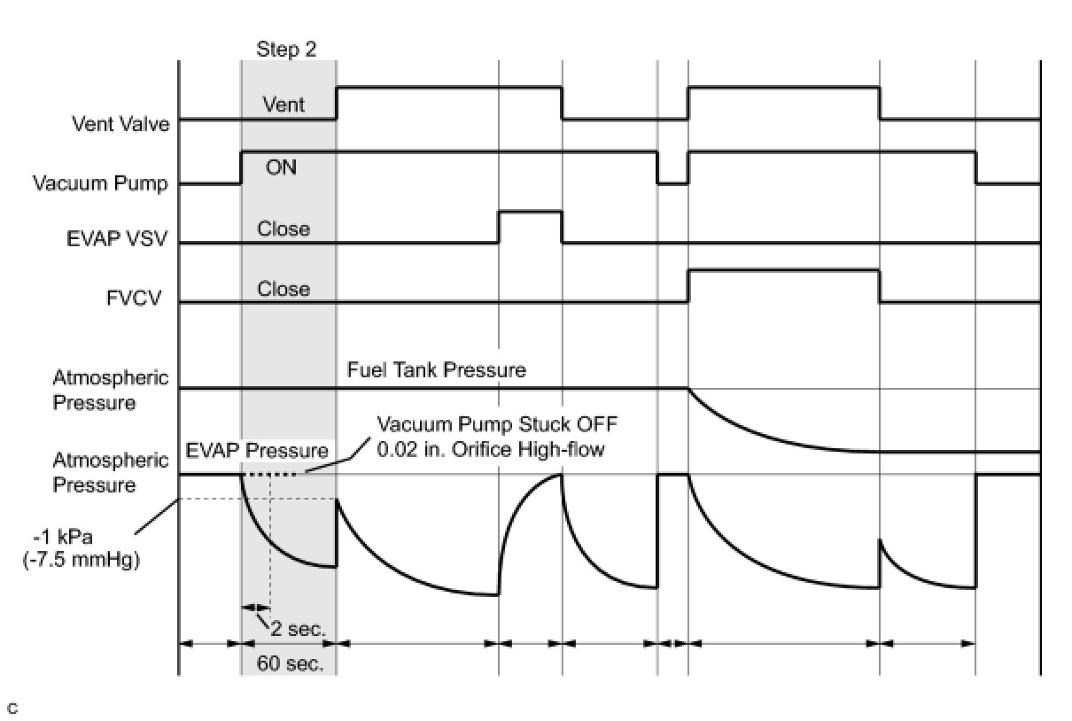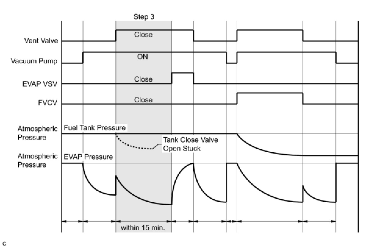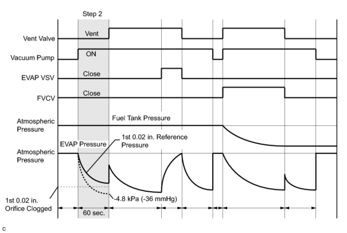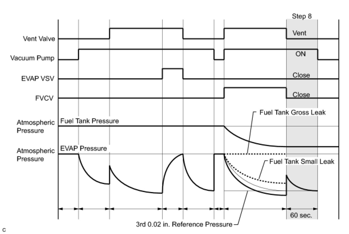 1 If the fuel tank pressure is higher or lower than the atmospheric pressure, the system determines that there are no leaks in the closed tank system and the system will check for leaks from the piping and canister between the EVAP VSV and pump module. (Method A)