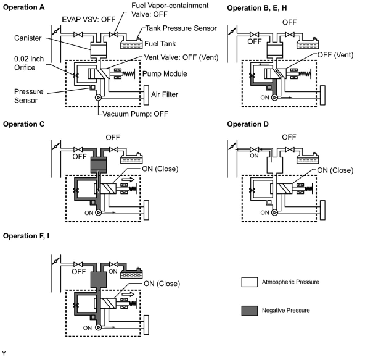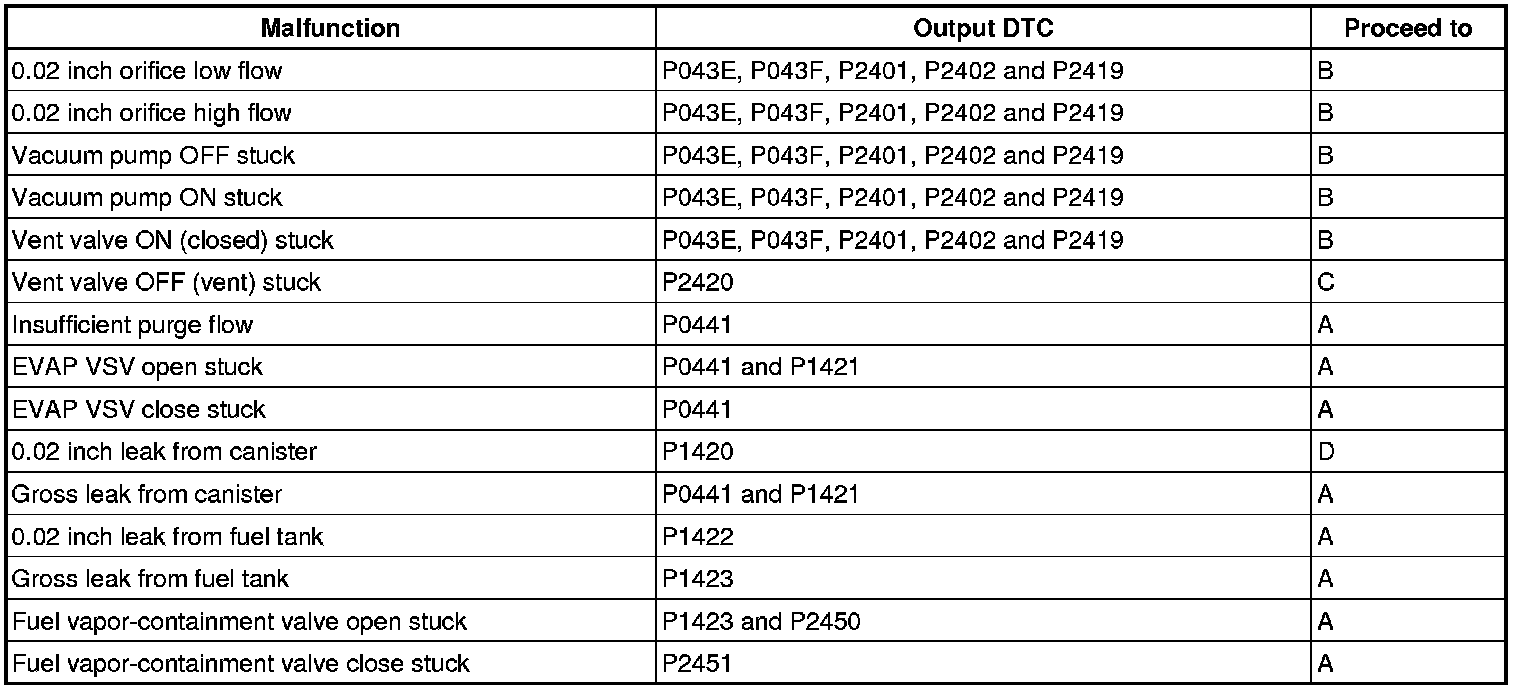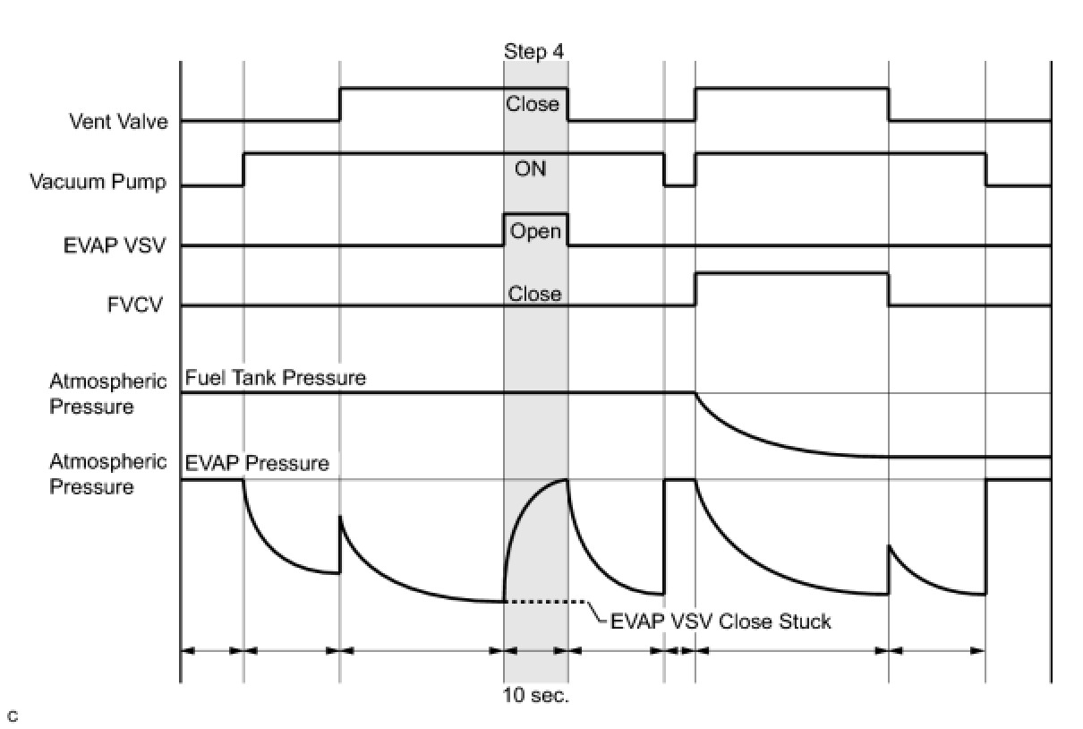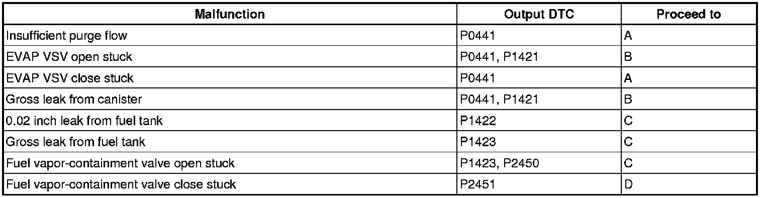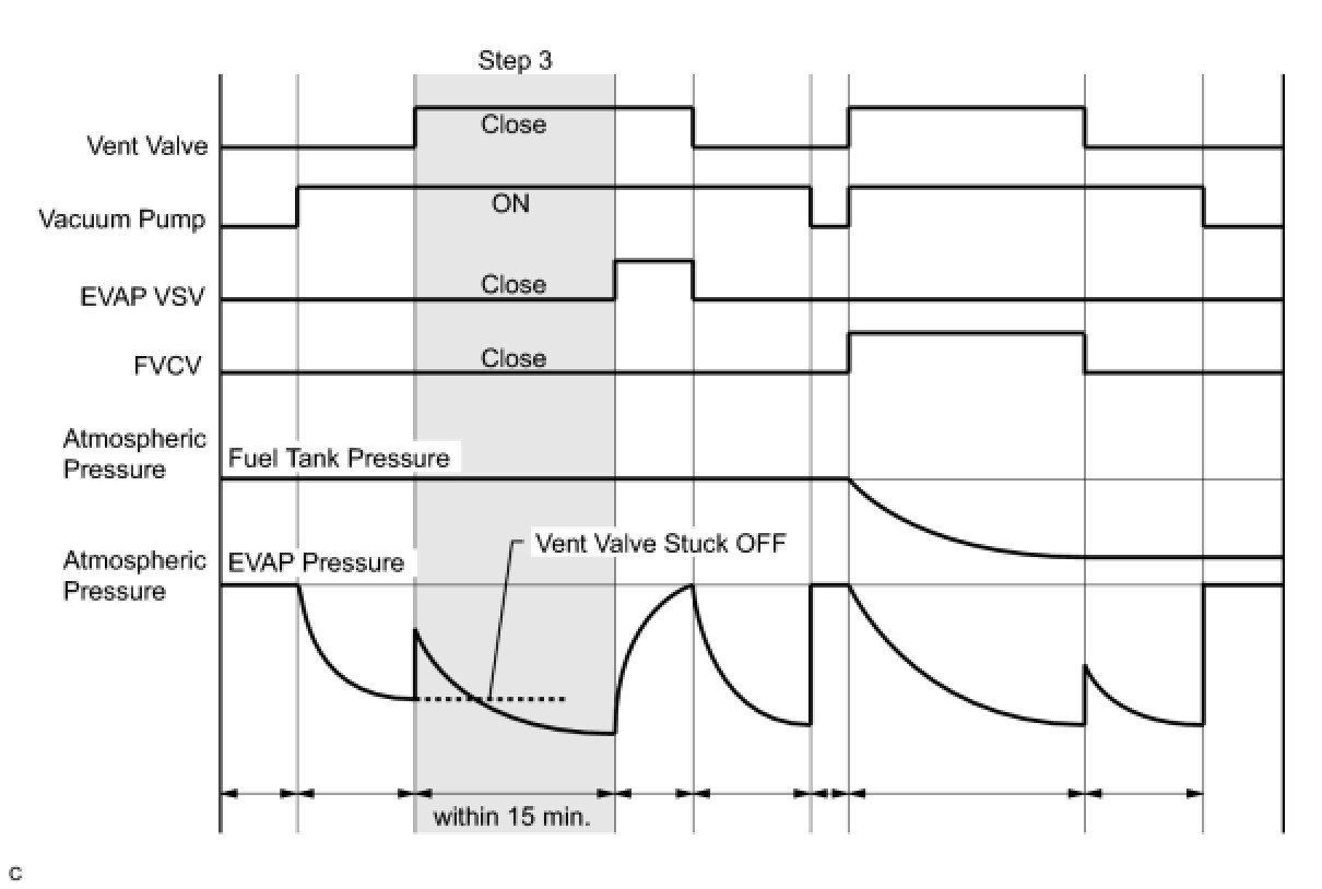 1 If the fuel tank pressure is higher or lower than the atmospheric pressure, the system determines that there are no leaks in the closed tank system and the system will check for leaks from the piping and canister between the EVAP VSV and pump module. (Method A)