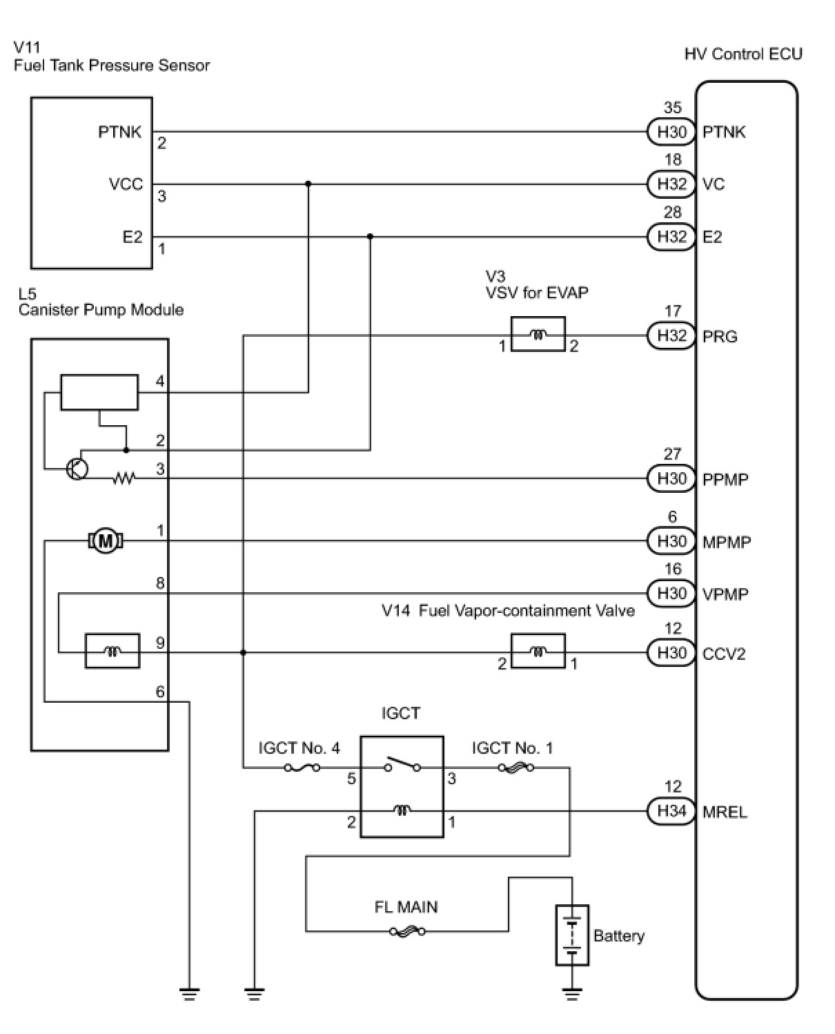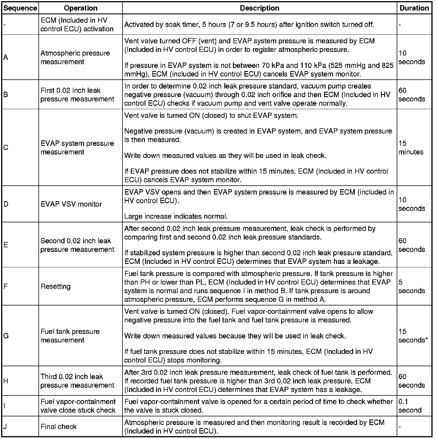 While the engine is running, if a predetermined condition (closed loop, etc.) is met, the EVAP VSV is opened by the ECM (Included in HV control ECU) and stored fuel vapors in the canister are purged to the intake manifold. The ECM will change the duty cycle ratio of the EVAP VSV to control purge flow volume.