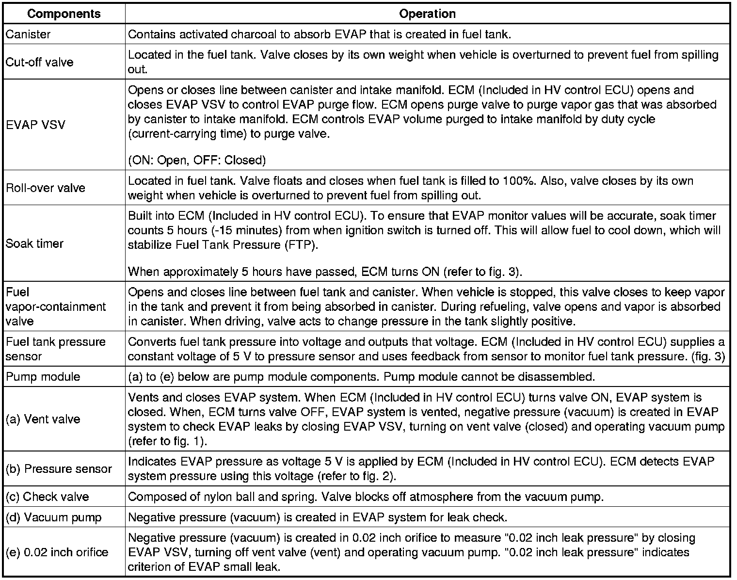 This monitoring system checks for pump module malfunctions and leaks from the EVAP and closed tank systems. Be sure to leave the vehicle for at least 5 hours to sufficiently cool the fuel and stabilize fuel tank pressure. This makes EVAP system monitoring more accurate.
