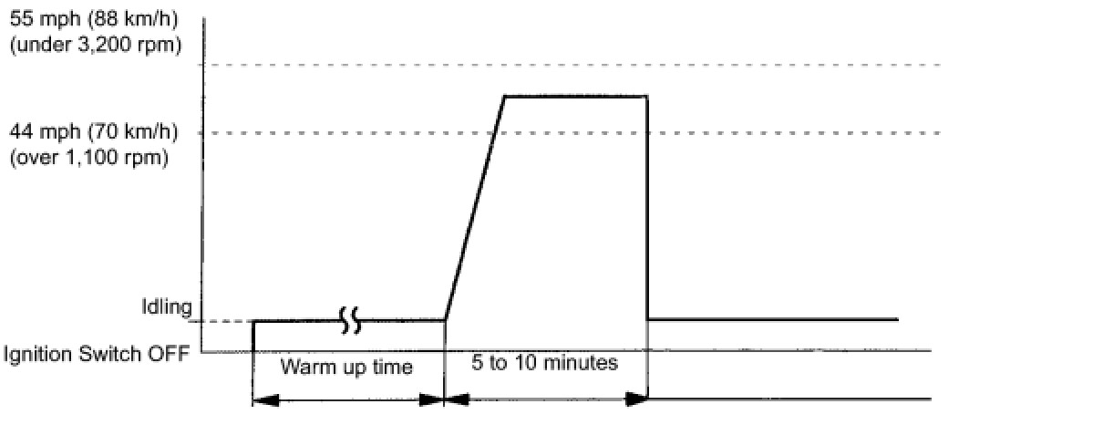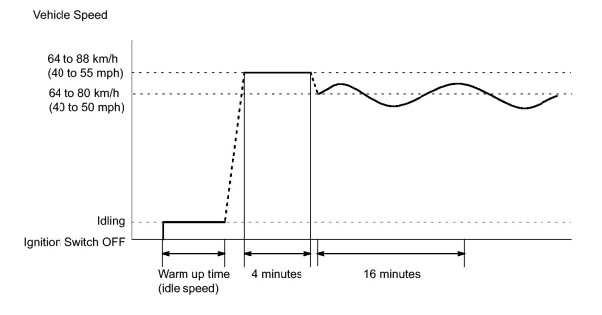 NOTE: Drive with smooth throttle operation and avoid sudden acceleration. If IAT was less than 10°C (50°F) when the engine was started, drive the vehicle at 47 to 55 mph (75 to 88 km/h) for additional 4 minutes.
