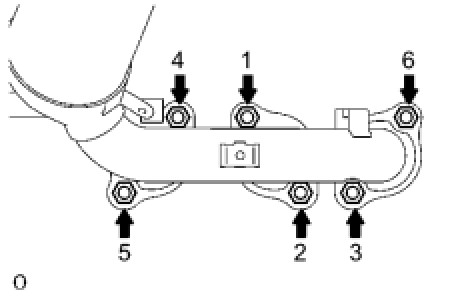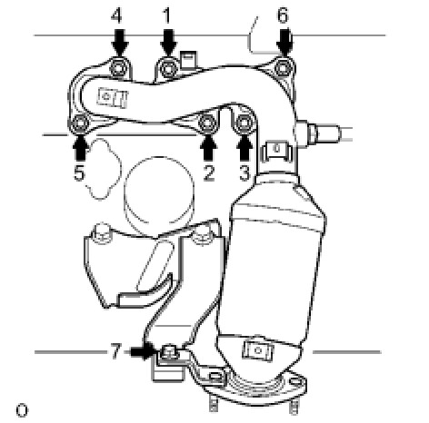EXHAUST MANIFOLD CONVERTER SUB-ASSEMBLY NO.2Install the exhaust manifold converter No.2 with the 6 nuts and bolt. Using several steps, tighten the nuts uniformly in the sequence shown in the illustration.