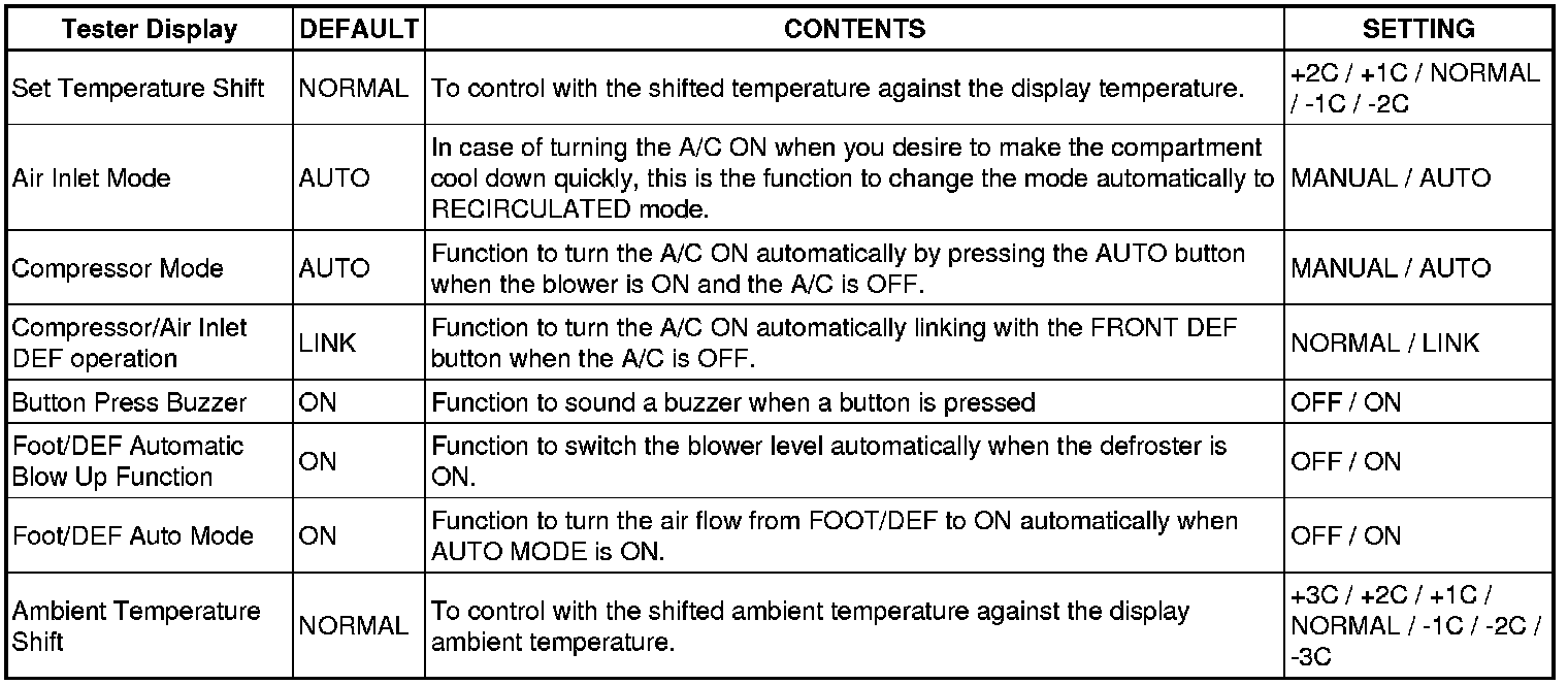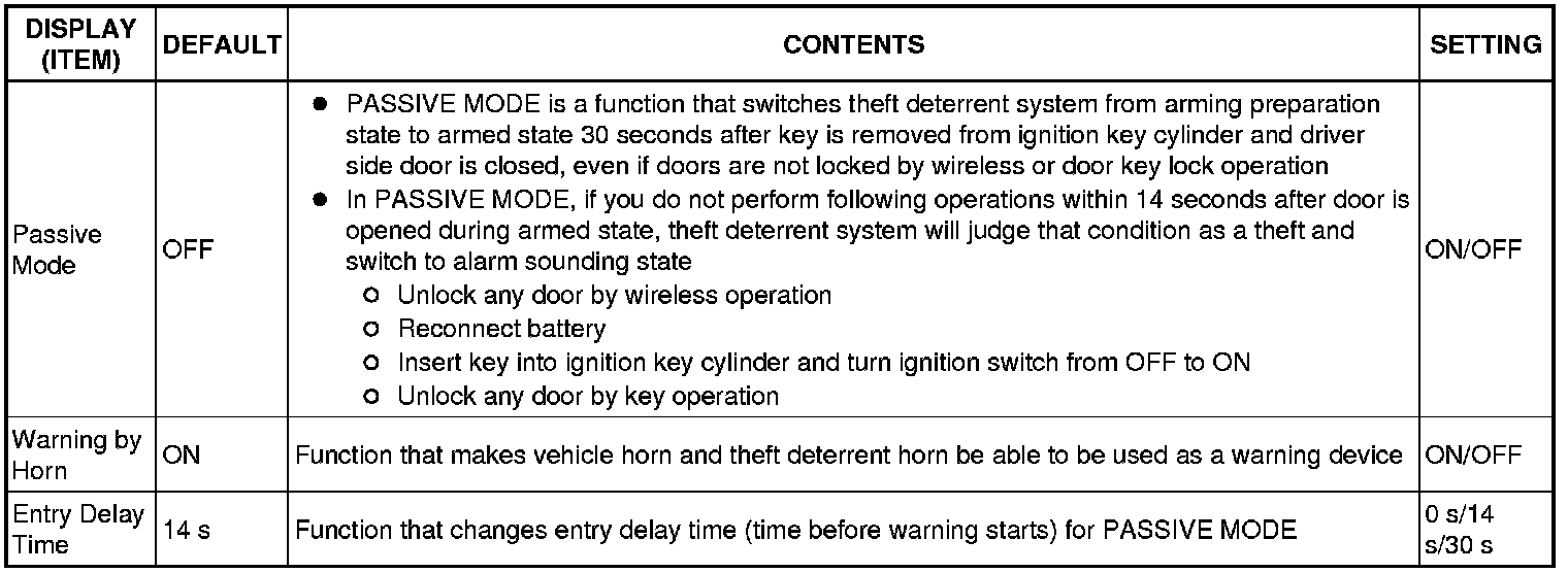 The buzzer ON/OFF setting, which is a setting of the buzzer function of the combination meter, can disable the driver and front passenger side seat belt buzzers.