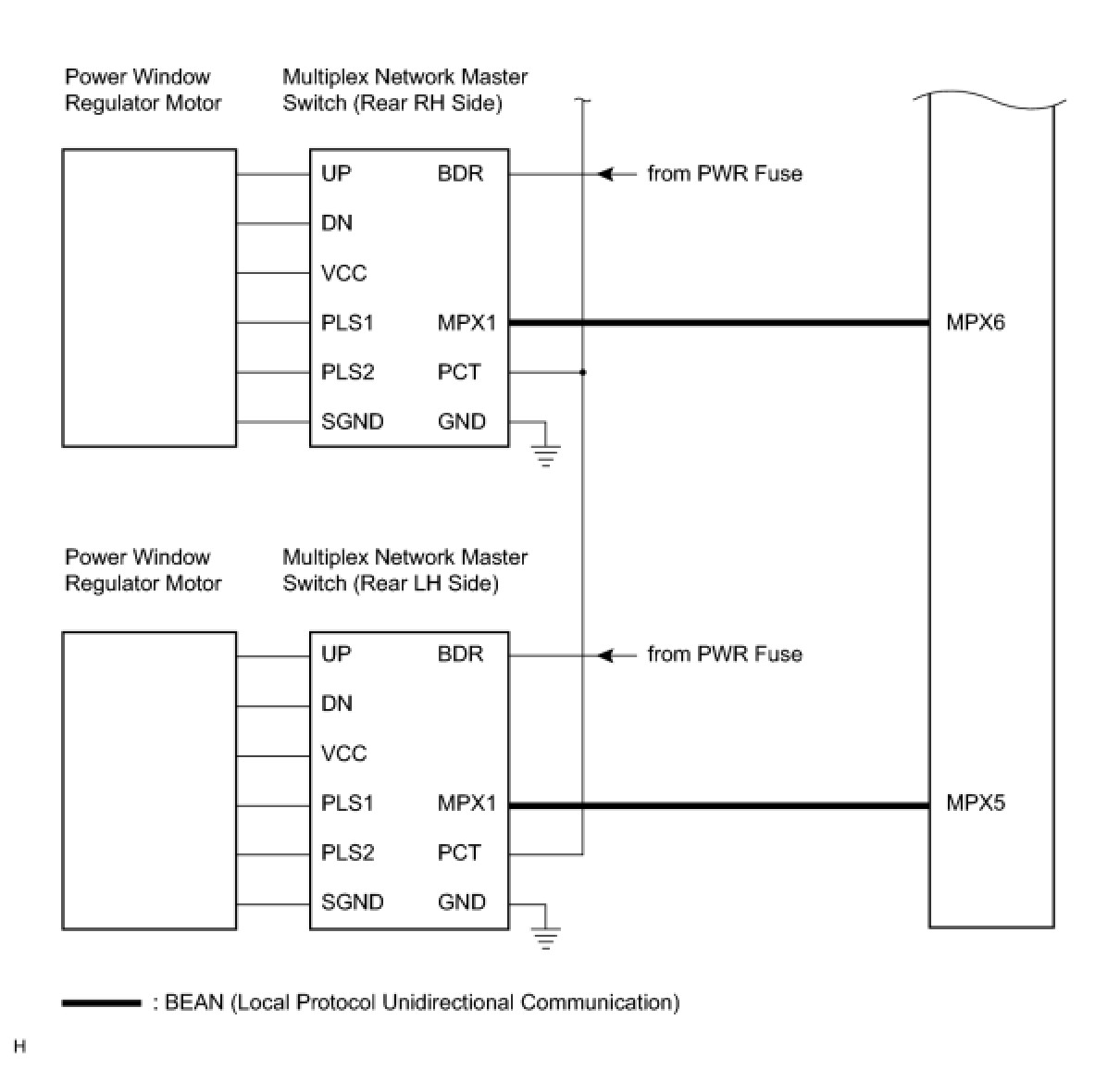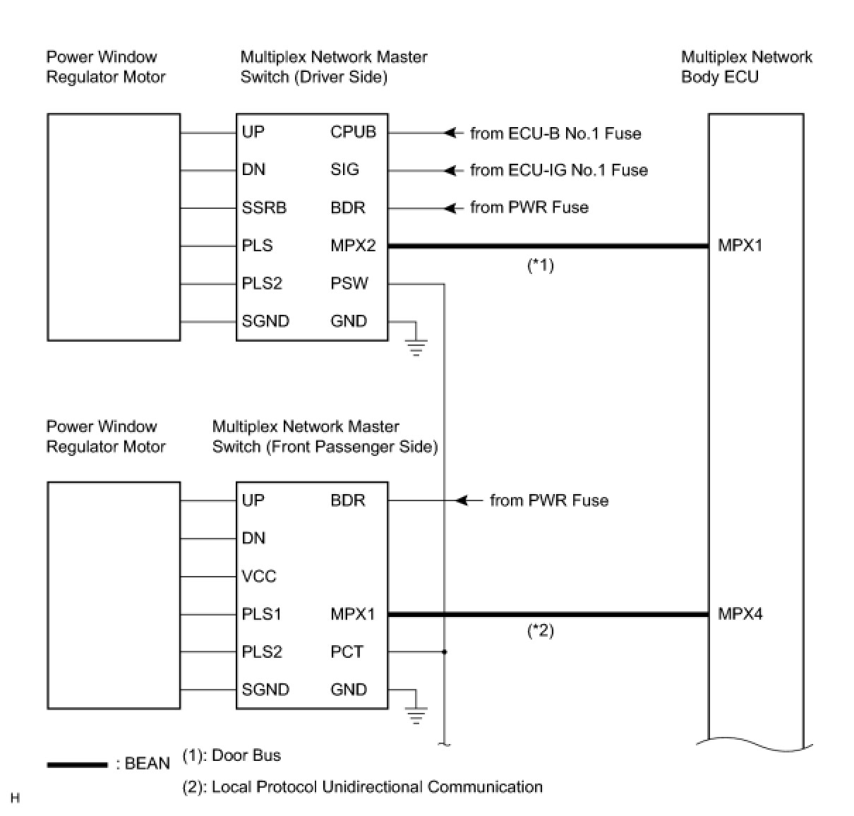 (a) The power window control system controls the power window UP/DOWN function by using regulator motors. This system is mainly controlled by the multiplex network master switch built into the driver's door and multiplex network switches built into passenger's doors. Pressing any of these multiplex network switches or the driver side door window switch mounted on the master switch transmits an UP/DOWN signal to the regulator motor for the corresponding power window, which then operates the power window UP/DOWN. Pressing any switch for the power windows except the driver's power window mounted on the master switch transmits a remote UP/DOWN signal to the body ECU via the BEAN line. Then the body ECU transmits this remote signal to the regulator switch for the corresponding power window via the BEAN line and activates the motor to open/close the power window.