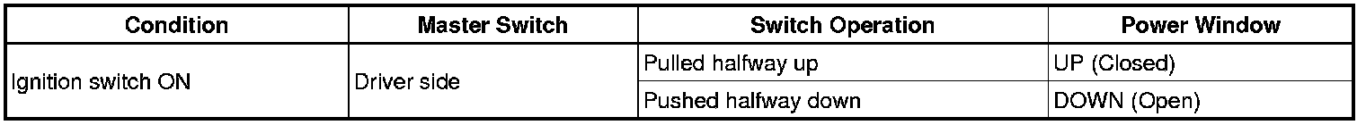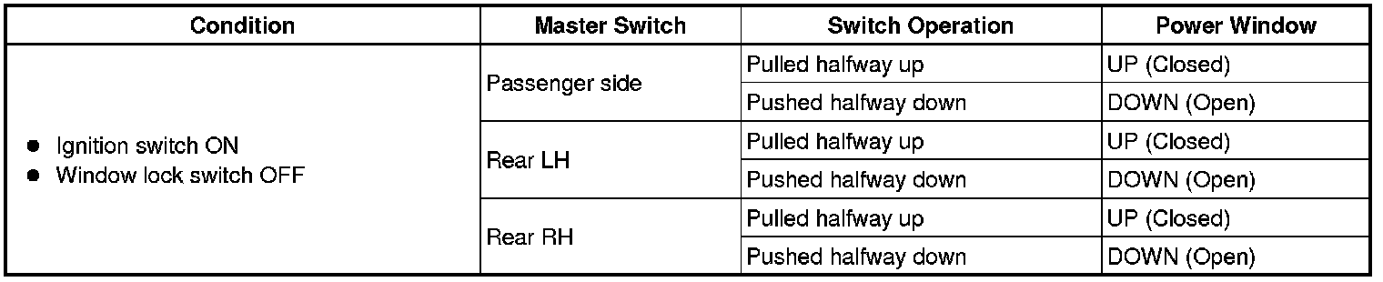 NOTE: If the power window motor has been reset, raise and lower the door glass several times using MANUAL function before performing the check.