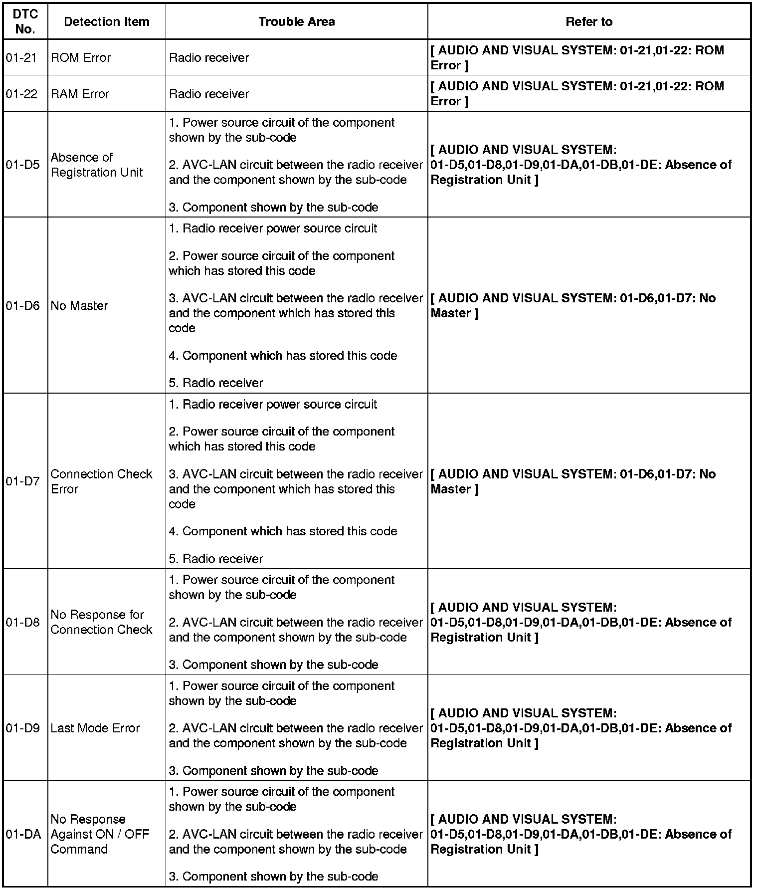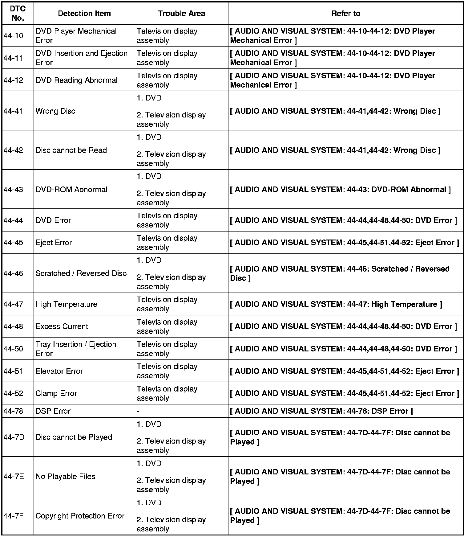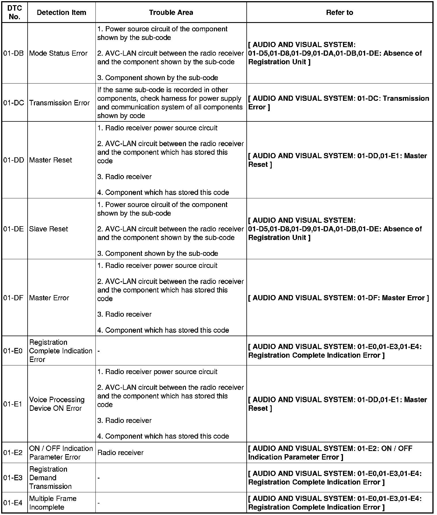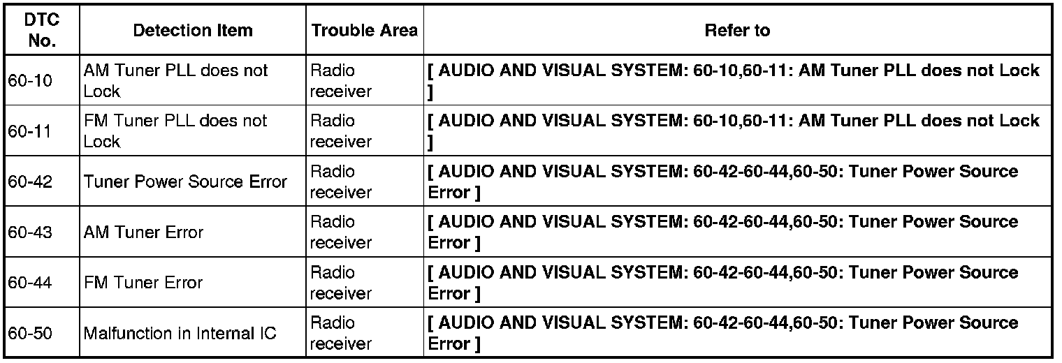 AUDIO / VISUAL: AUDIO AND VISUAL SYSTEM: DIAGNOSTIC TROUBLE CODE CHART