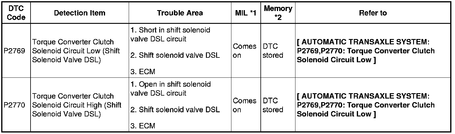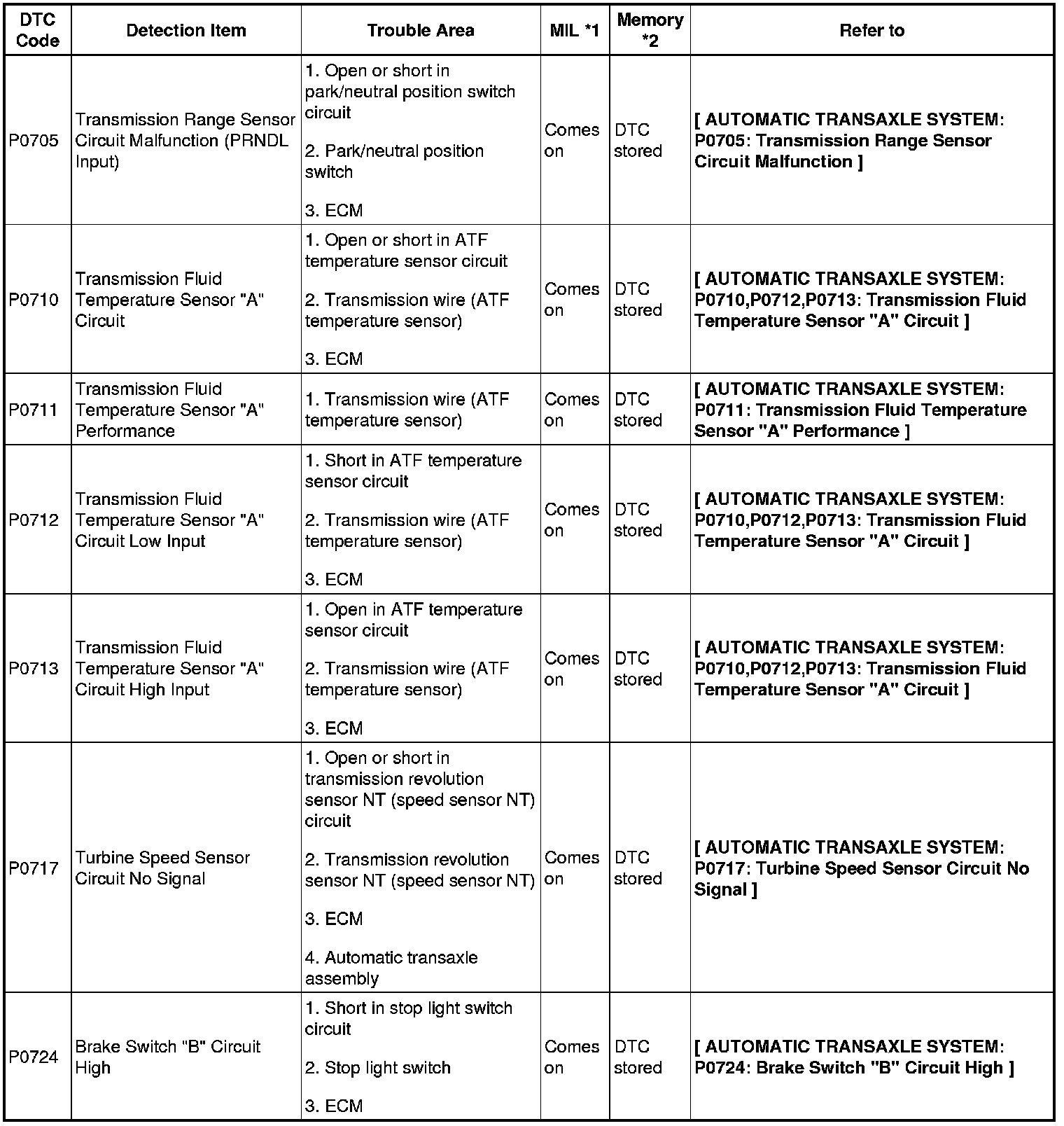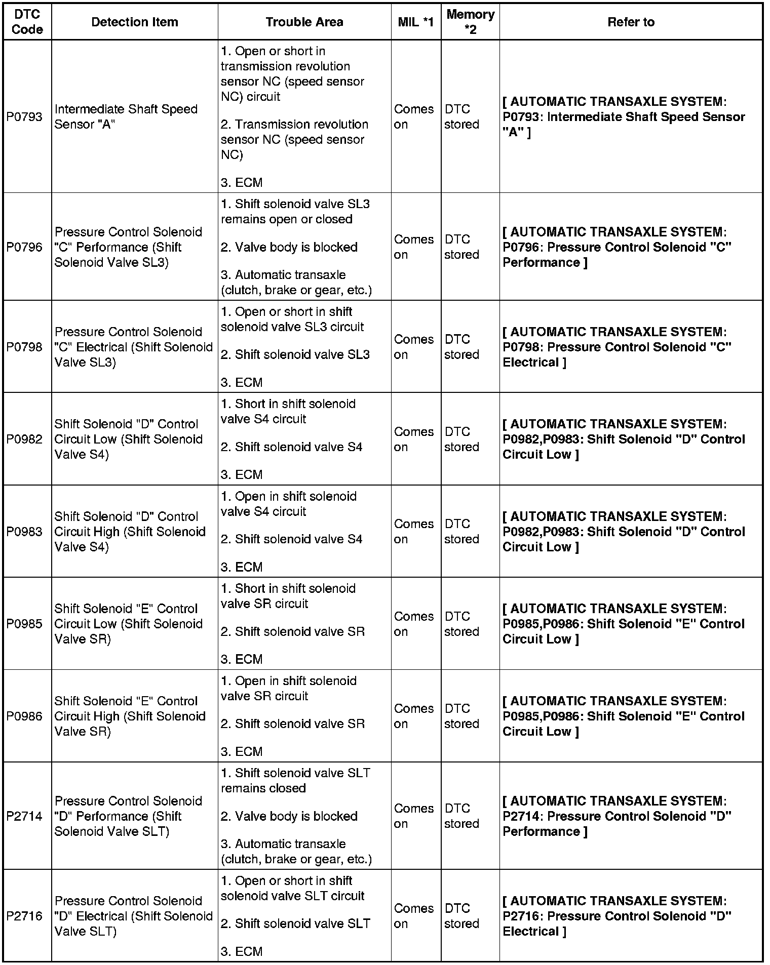 - *2: "DTC stored" mark means ECM memorizes the malfunction code if the ECM detects the DTC detection condition.