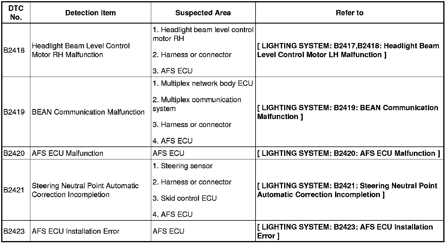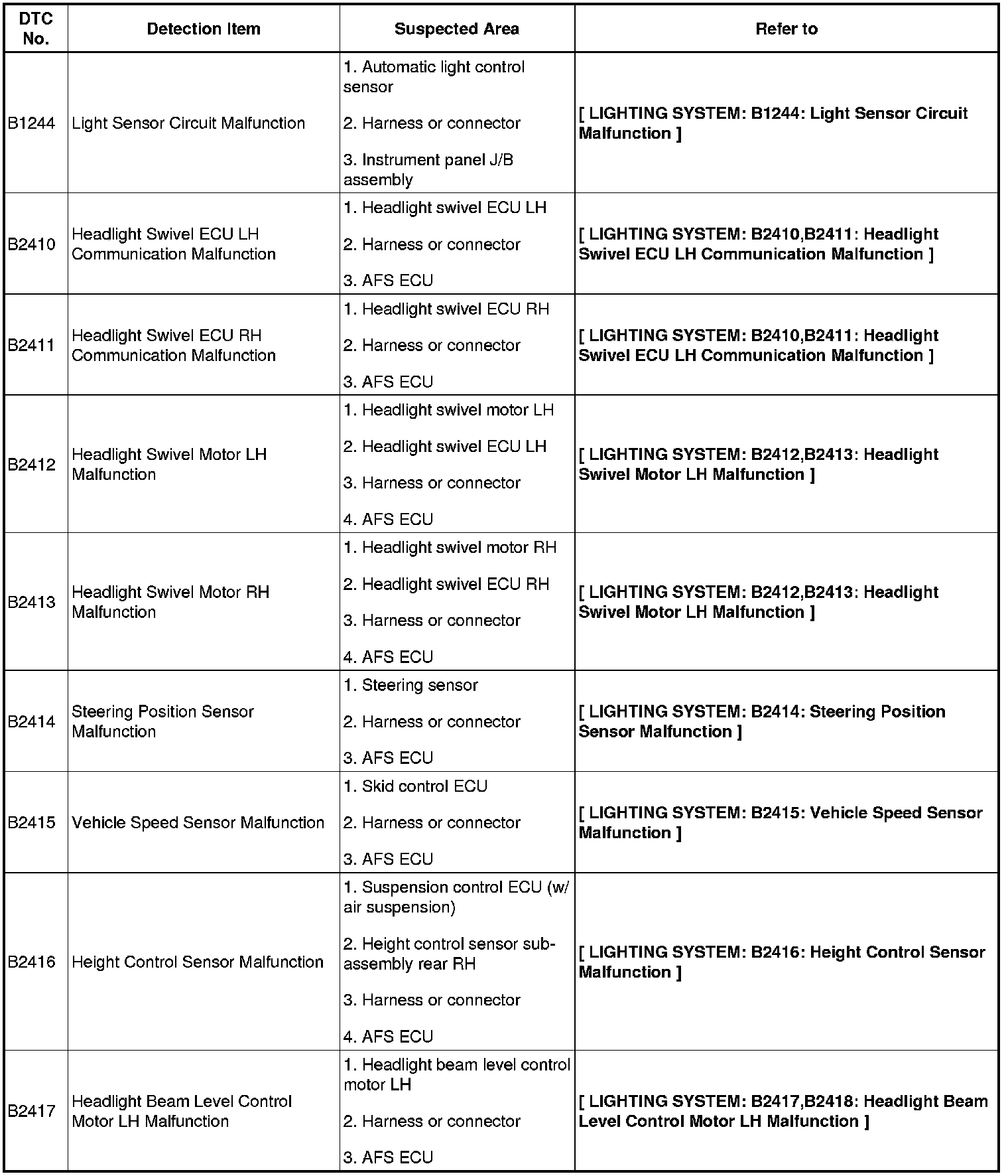 LIGHTING: LIGHTING SYSTEM: DIAGNOSTIC TROUBLE CODE CHART