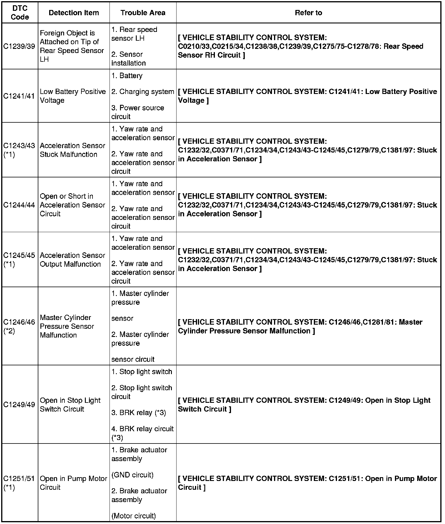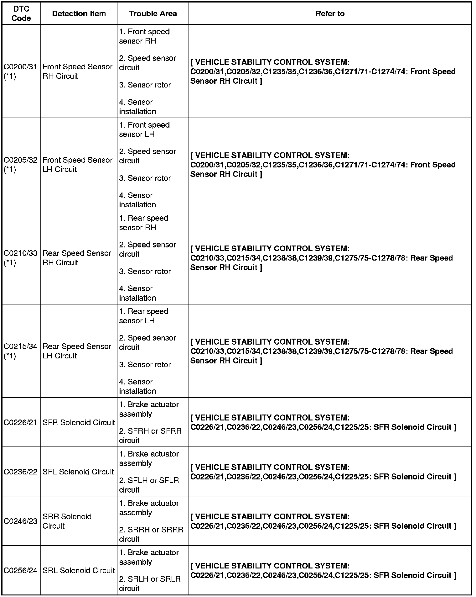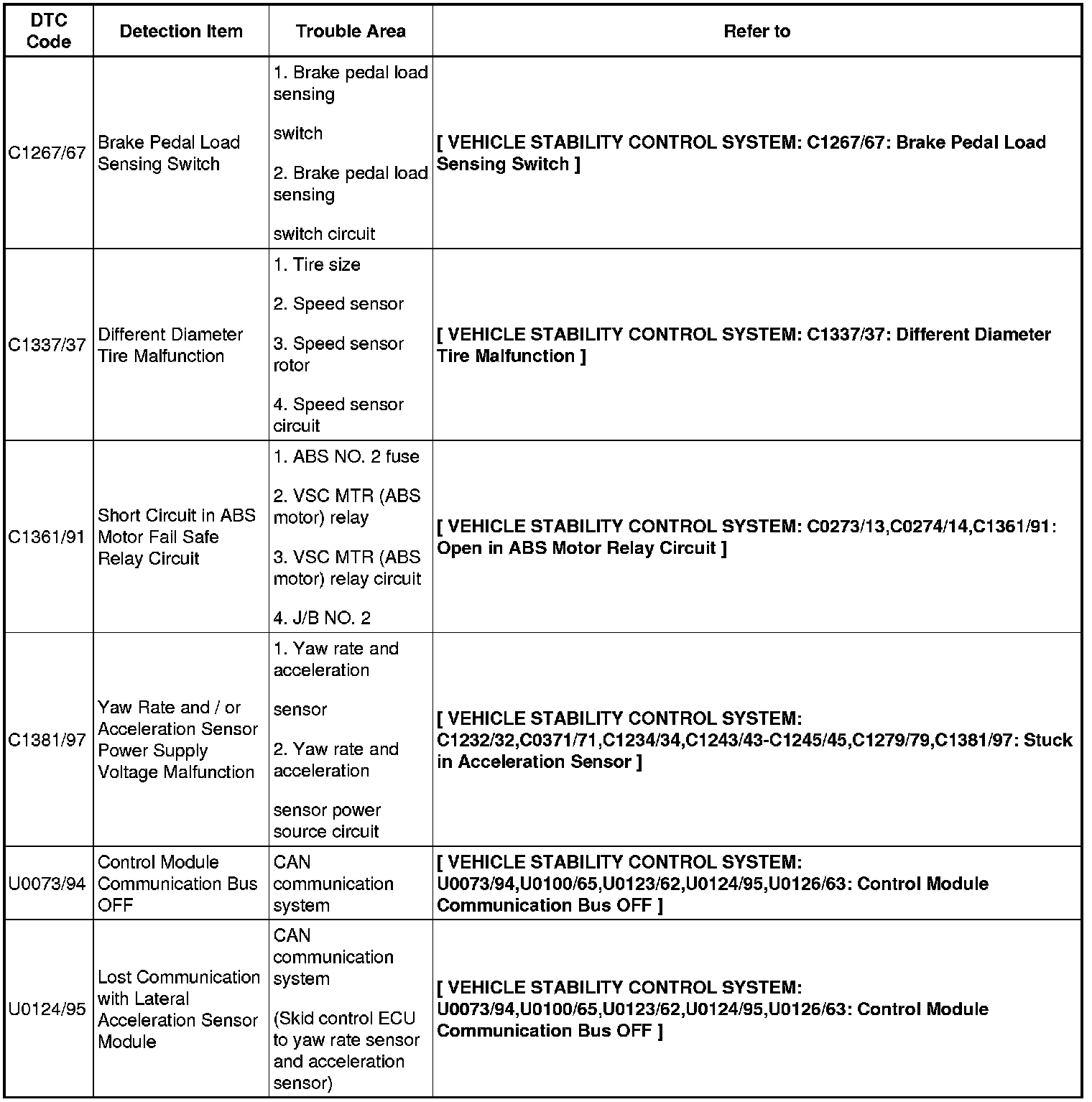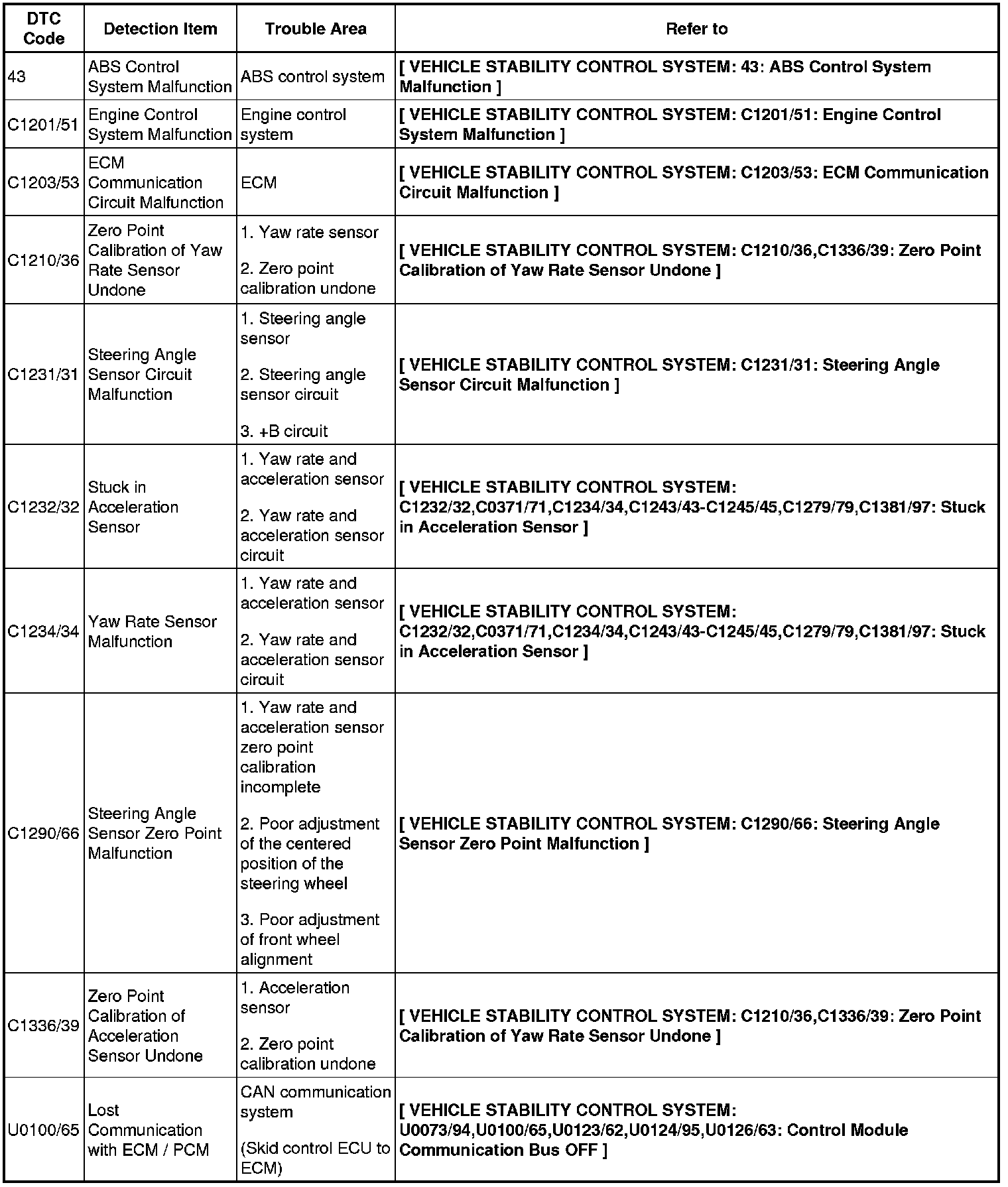 BRAKE CONTROL: VEHICLE STABILITY CONTROL SYSTEM: DIAGNOSTIC TROUBLE CODE CHART