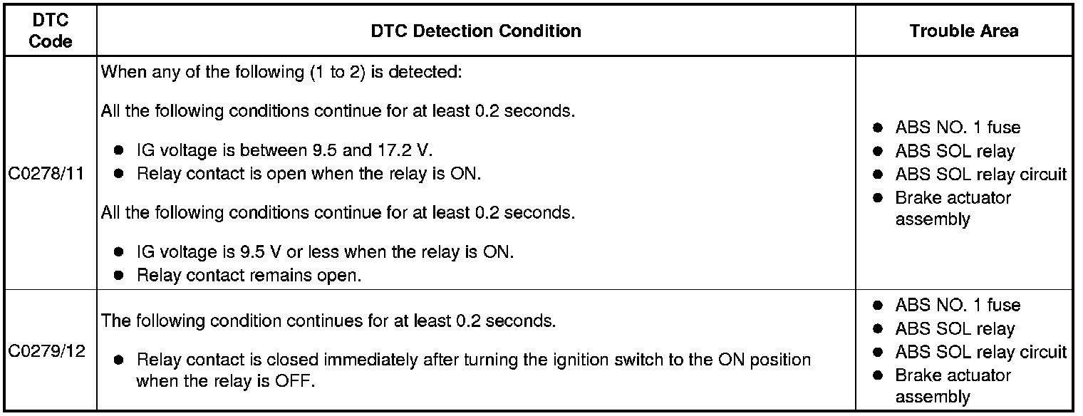 BRAKE CONTROL: VEHICLE STABILITY CONTROL SYSTEM: C0278/11,C0279/12: Open in ABS Solenoid Relay Circuit