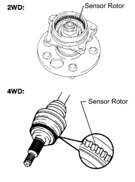 The speed sensors detect wheel speed and send the signals to the ECU. These signals are used to control the ABS control system. Each of the front and rear rotors has 48 serrations.