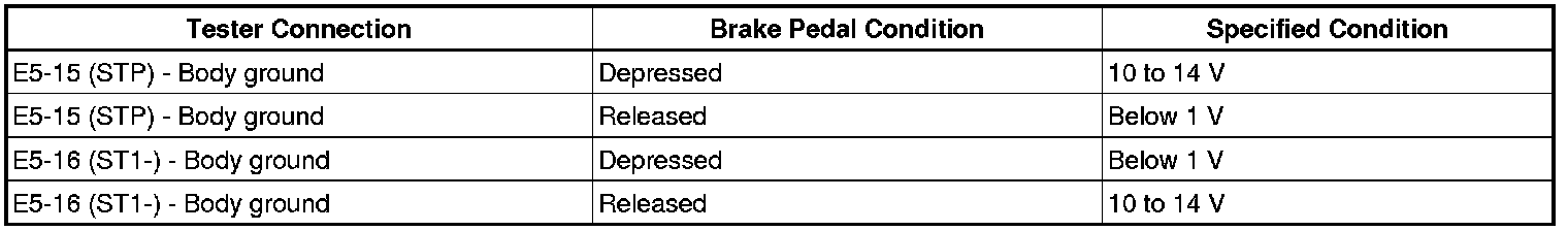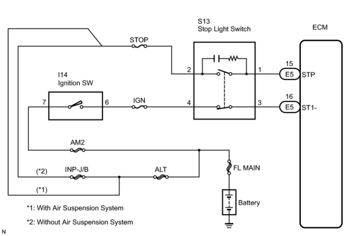 When the brake pedal is depressed, the stop light switch sends a signal to the ECM. When the ECM receives this signal, it cancels the cruise control. The fail-safe function operates to enable normal driving even if there is a malfunction in the stop light signal circuit. The cancellation condition occurs when voltage is applied to terminal STP. When the brake is applied, voltage is normally applied to terminal STP of the ECM through the STOP SW fuse and the stop light switch, and the ECM turns the cruise control off.
